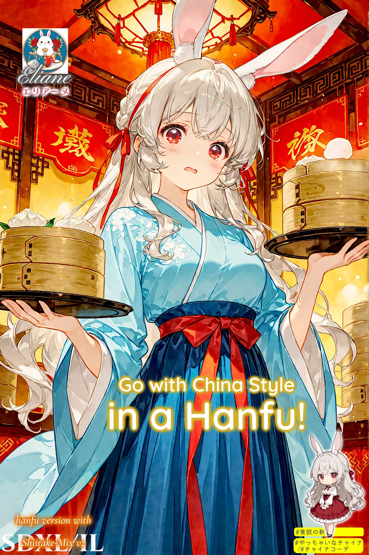 Gemini(nano-banana)では画像内にある文字は消えてよしなに合成されることが多かったですが、エリアーヌと重ねて配置してあるメインタイトルの「Go with China Style in a Hanfu!」(≒漢服でチャイナスタイルやっチャイナ!)は完璧に維持。