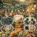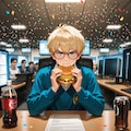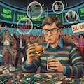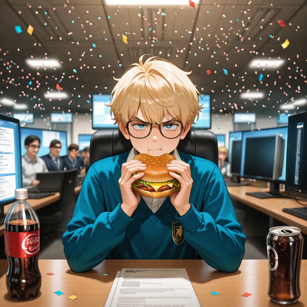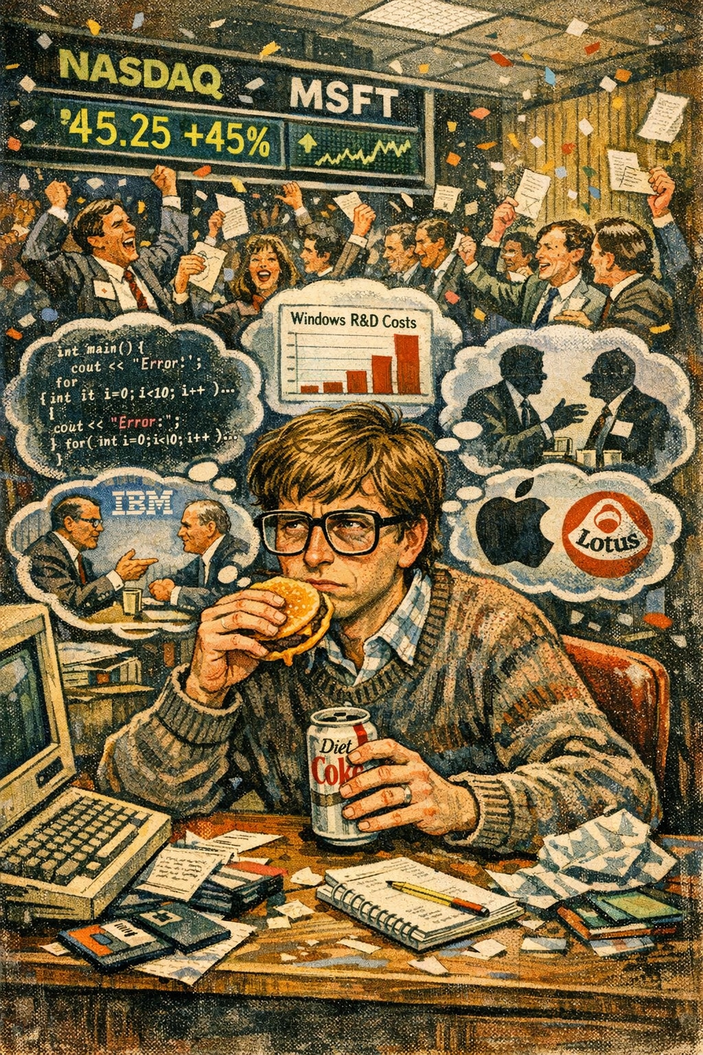Masterpiece, Best Quality, Amazing Quality, Very Aesthetic, High Resolution, Ultra-Detailed, Absurdres, Newest, Scenery, 3D, Rendered, (1boy, male:1.5), solo, young man, messy blonde hair, oversized eyeglasses, knit sweater over collared shirt, grumpy, annoyed, frown, looking at viewer, sitting at desk, eating cheeseburger, holding soda bottle, brown diet soda, office, 1980s style, indoor, crowded background, blurred people, cheering, business suit, celebrating, confetti, computer monitors, stock ticker, glowing text, "MSFT", "NASDAQ", "27.75", green line graph, upward trend, retro technology, thought bubble, floating objects, computer code, source code, financial charts, bar graph, currency symbol, dollar sign, silhouette of rival logos, business meeting, paperwork, stacks of documents, retro artstyle, 1980s magazine illustration, cel shading, vibrant colors, high contrast, detailed background, masterpiece, highres, Cinematic_Lighting, BREAK Depth_of_Field, Volumetric_Lighting