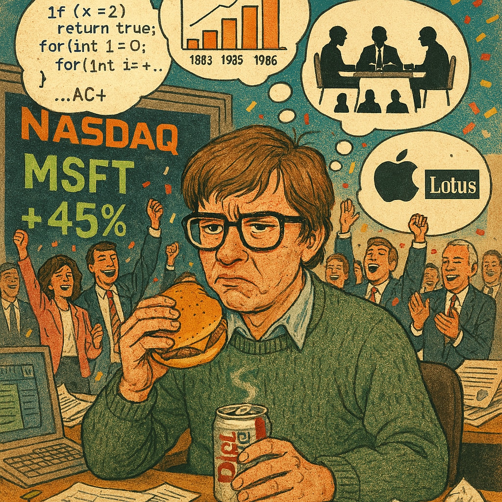 ビル・ゲイツという男は、当時「上場なんて時間の無駄。開発の邪魔だ」と言い切っていました。まるで「自分、全然勉強してないからテストやばいわ」と言いつつ満点を取る学生のようなムーブですが、現実は非情です。社員に配りまくった株券のせいで株主数が増えすぎ、法的に「強制上場」のカウントダウンが始まっていた。いわば、**「あまりに優秀すぎて、市場に引きずり出された」**格好です。