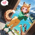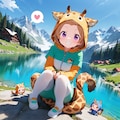 翡翠色の美しい水をたたえる高山湖の周囲を散策するキリン着ぐるみちび子ちゃんヾ(๑╹◡╹)ノ"