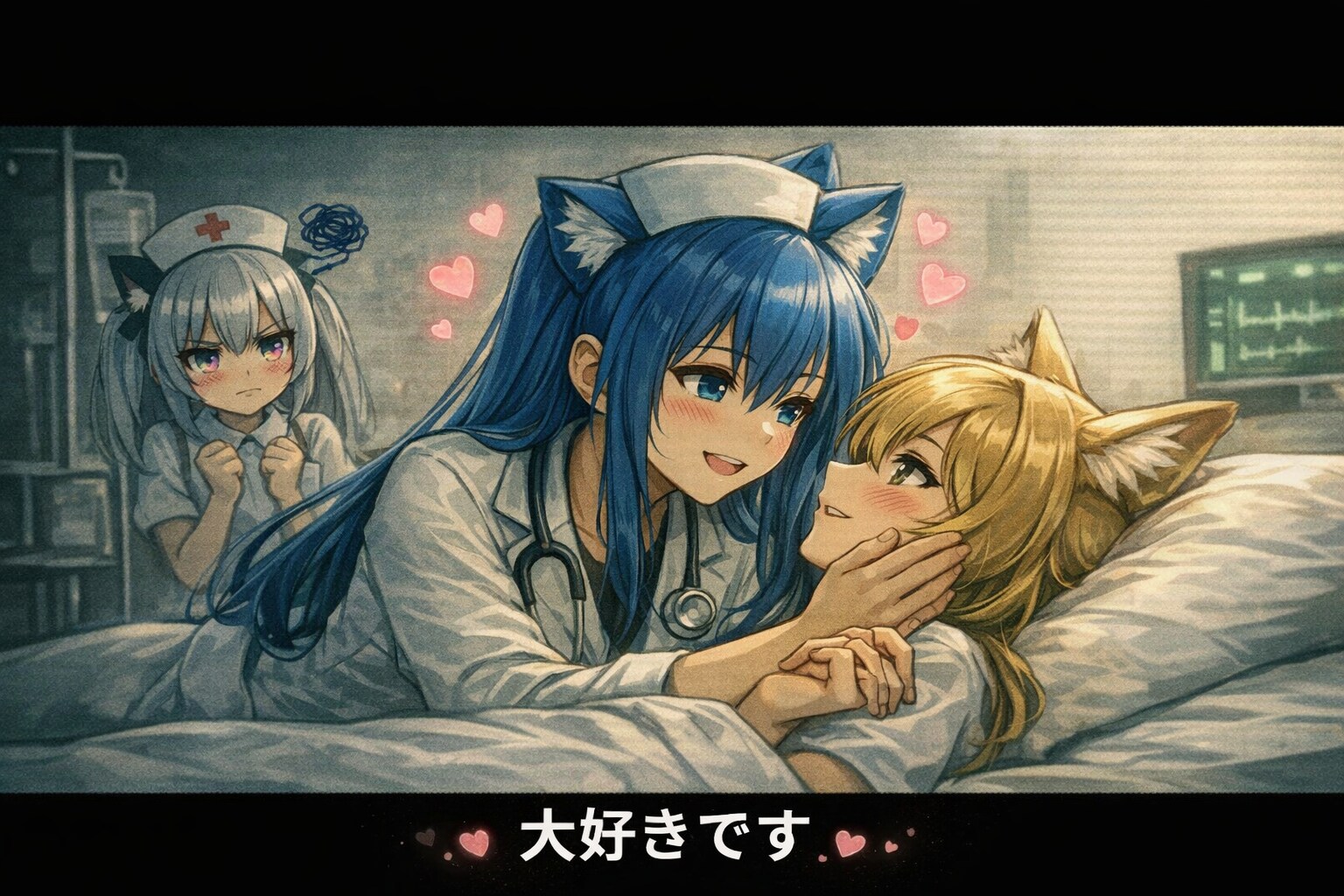 狐娘に対する猫耳医師の次のセリフ、および状況を生成してください