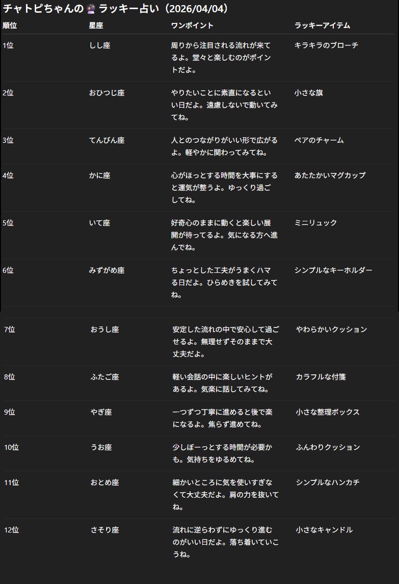 チャトピちゃん占い(04/04) 2026/04/03 使用したAI ChatGPT #チャトピちゃん占い 明日の運勢をお届けーチャトピちゃん占いー 呪文 入力なし ねこなみさくら 10,105 投稿 フォロー 1,215 フォロワー 1,331 ねこなみさくらは下記が好きな方に効果があります猫/メイドさん/猫耳/ろりっ子/謎な物/くすっとしたい/日替わり画像投稿量が多いのでホームの閲覧がお勧めです呪文やネタの利用はご自由にーR-15・18もー↓いろいろまとめーhttps://www.chichi-pui.com/posts/7835be9f-d077-48bb-b2c8-bbcb1003bf19/ ねこなみさくらさんの他の作品 ねこなみさくらさんの他の作品 チャトピちゃん占い(04/04) ねこなみさくら 超必殺技 ねこなみさくら きょうのオムライス(04/03) ねこなみさくら きょうの取引(04/03) ねこなみさくら きょうのアドバイス(04/02) ねこなみさくら チャトピちゃん占い(04/04) ねこなみさくら 超必殺技 ねこなみさくら きょうのオムライス(04/03) ねこなみさくら きょうの取引(04/03) ねこなみさくら きょうのアドバイス(04/02) ねこなみさくら DAISYさんで喋る電動マッサージ機 ねこなみさくら