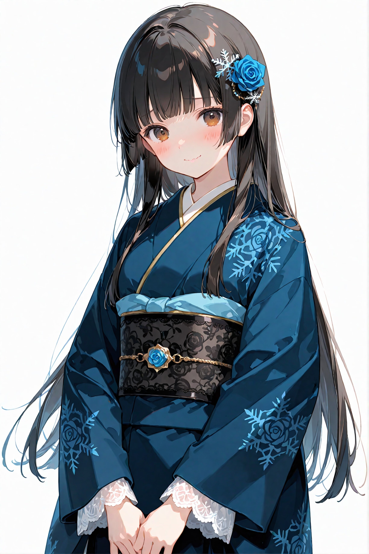 gothic kimono outfit, black and blue kimono, lace layered sleeves, blue rose patterns, corset style obi belt, imperial gothic style あたりを追加指定しています。