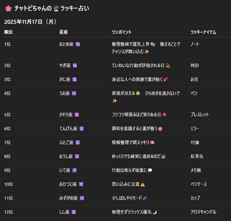 チャトピちゃん占い(11/17) 2025/11/16 使用したAI その他 #チャトピちゃん占い 明日の運勢をお届けーチャトピちゃん占いー 呪文 入力なし ねこなみさくら 8,677 投稿 フォロー 1,010 フォロワー 1,107 ねこなみさくらは下記が好きな方に効果があります猫/メイドさん/猫耳/ろりっ子/謎な物/くすっとしたい/日替わり画像投稿量が多いのでホームの閲覧がお勧めです呪文やネタの利用はご自由にーR-15・18もー生成用?自作診断メーカーまとめhttps://www.chichi-pui.com/posts/824ee8bb-e261-4f91-bb51-afb6142bc12b/ ねこなみさくらさんの他の作品 ねこなみさくらさんの他の作品 チャトピちゃん占い(12/07) ねこなみさくら きょうのオムライス(12/06) ねこなみさくら かっこいいバイク ねこなみさくら Seedream4.5でミラさんを喋らせてみた ねこなみさくら チャトピちゃん占い(12/06) ねこなみさくら チャトピちゃん占い(12/07) ねこなみさくら きょうのオムライス(12/06) ねこなみさくら かっこいいバイク ねこなみさくら Seedream4.5でミラさんを喋らせてみた ねこなみさくら チャトピちゃん占い(12/06) ねこなみさくら 緑一色 ねこなみさくら