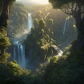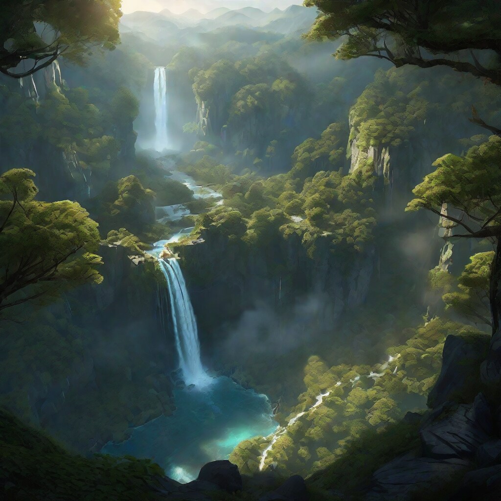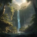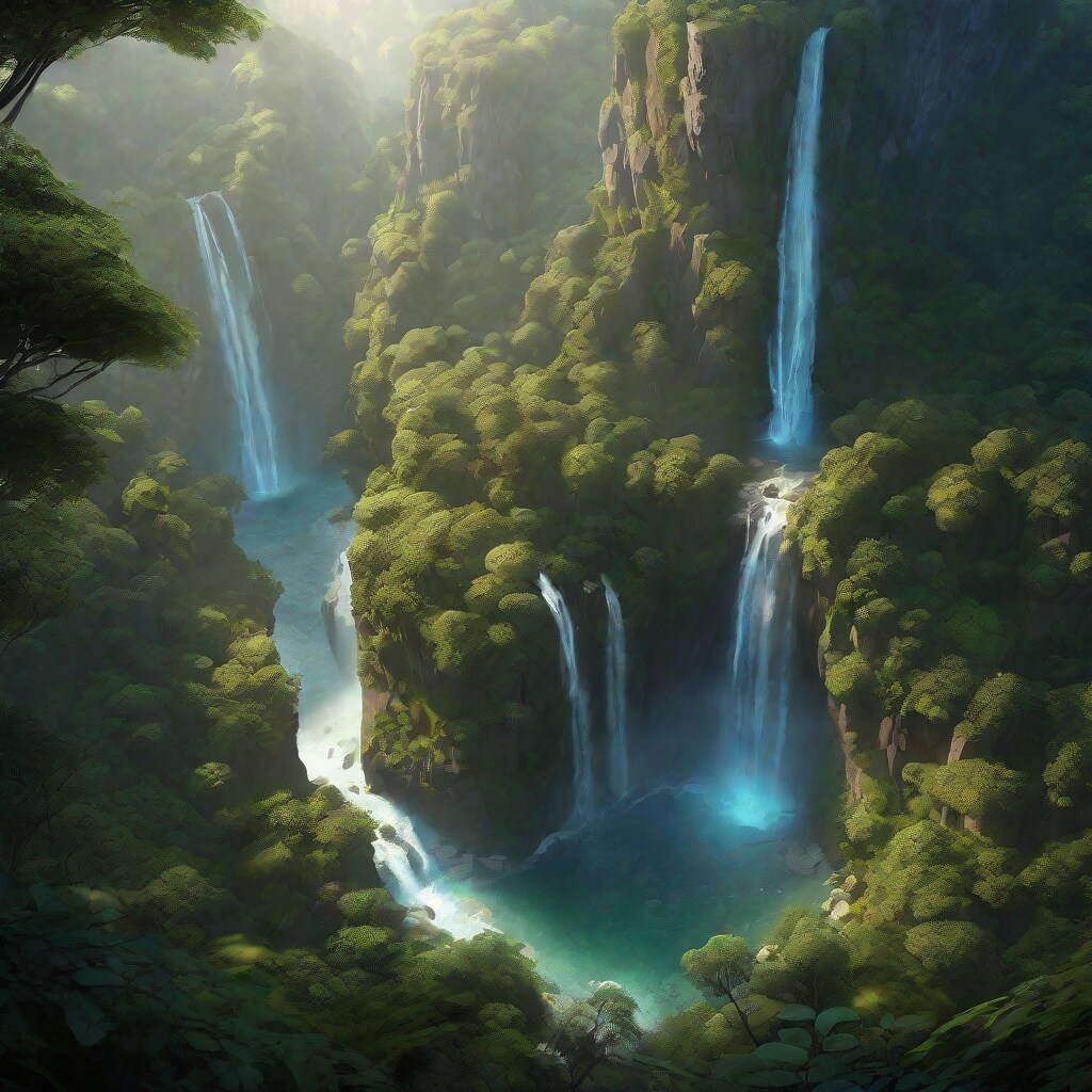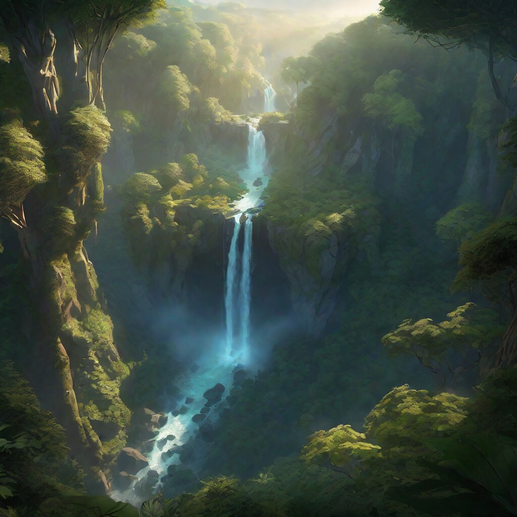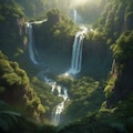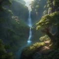 birds eye view over a mystical forest with a alluring waterfall, landscape,