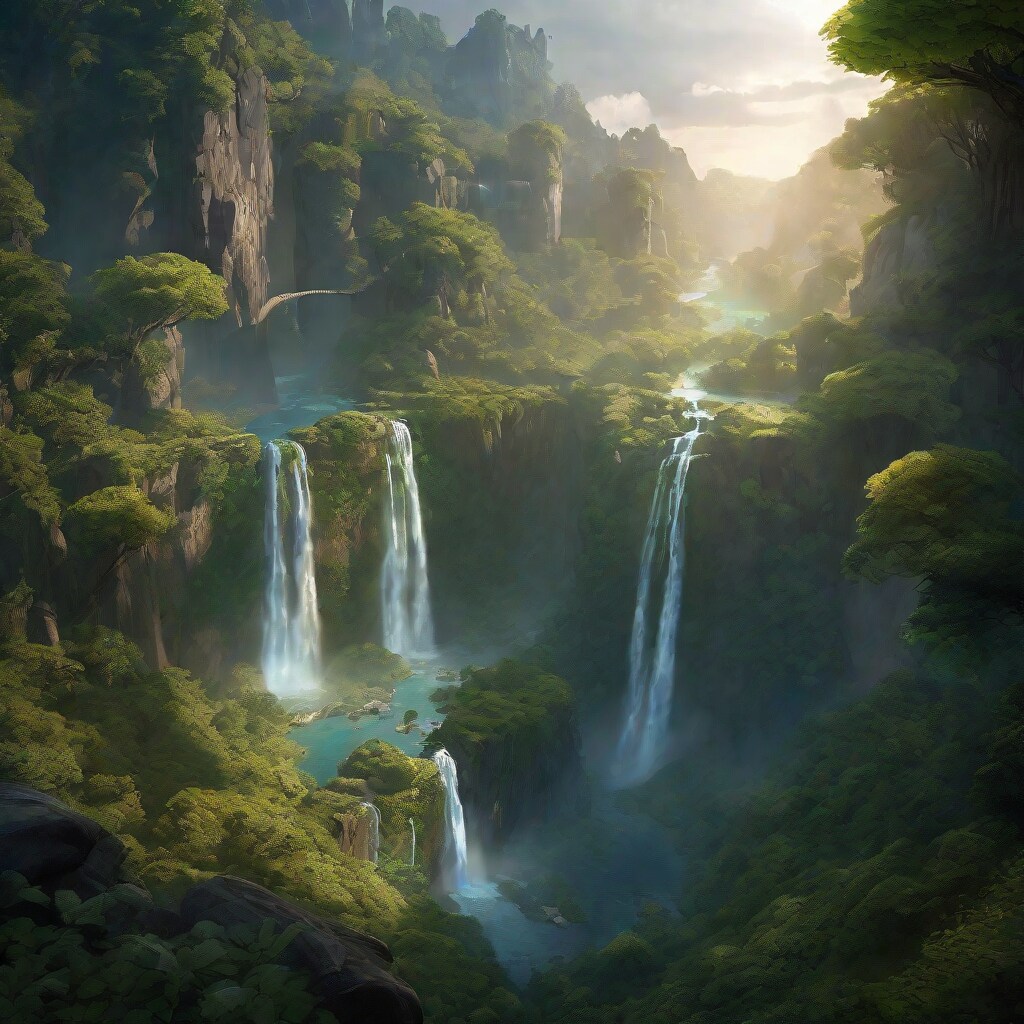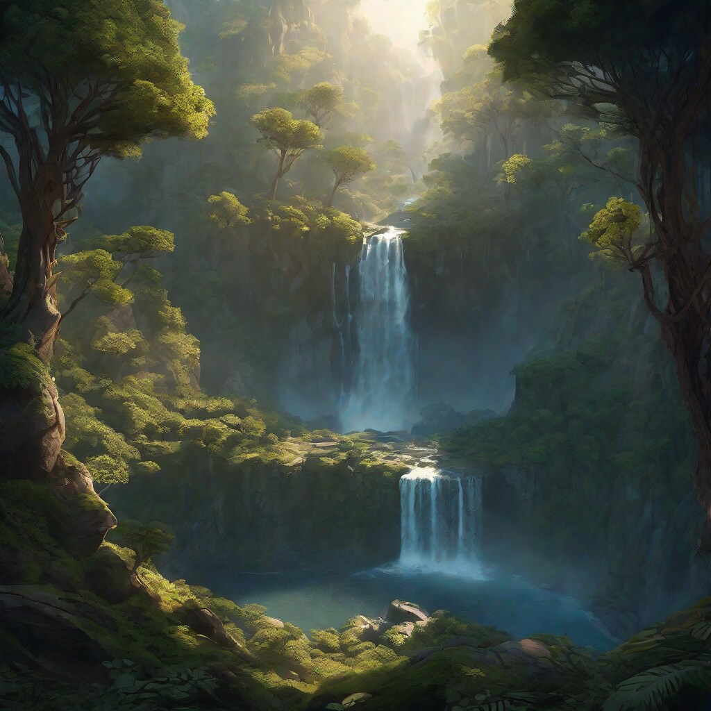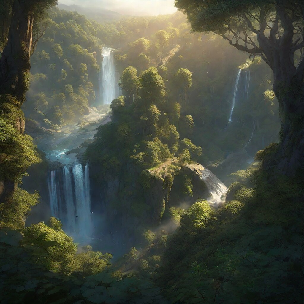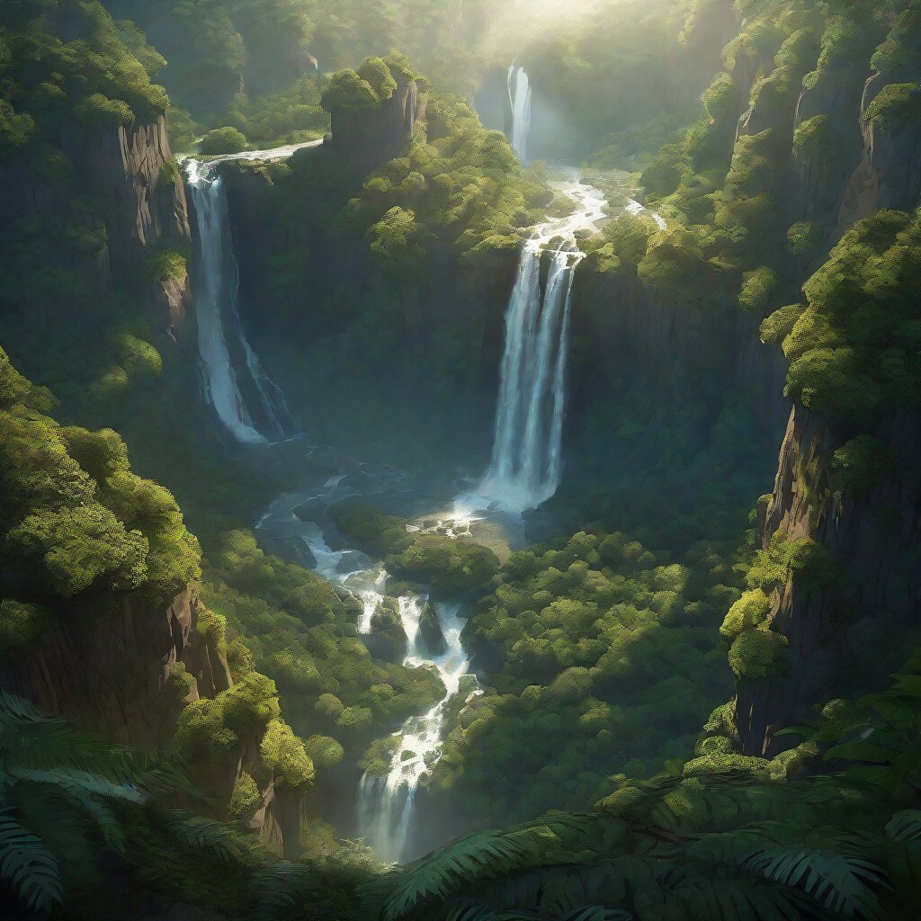 birds eye view over a mystical forest with a alluring waterfall, landscape,