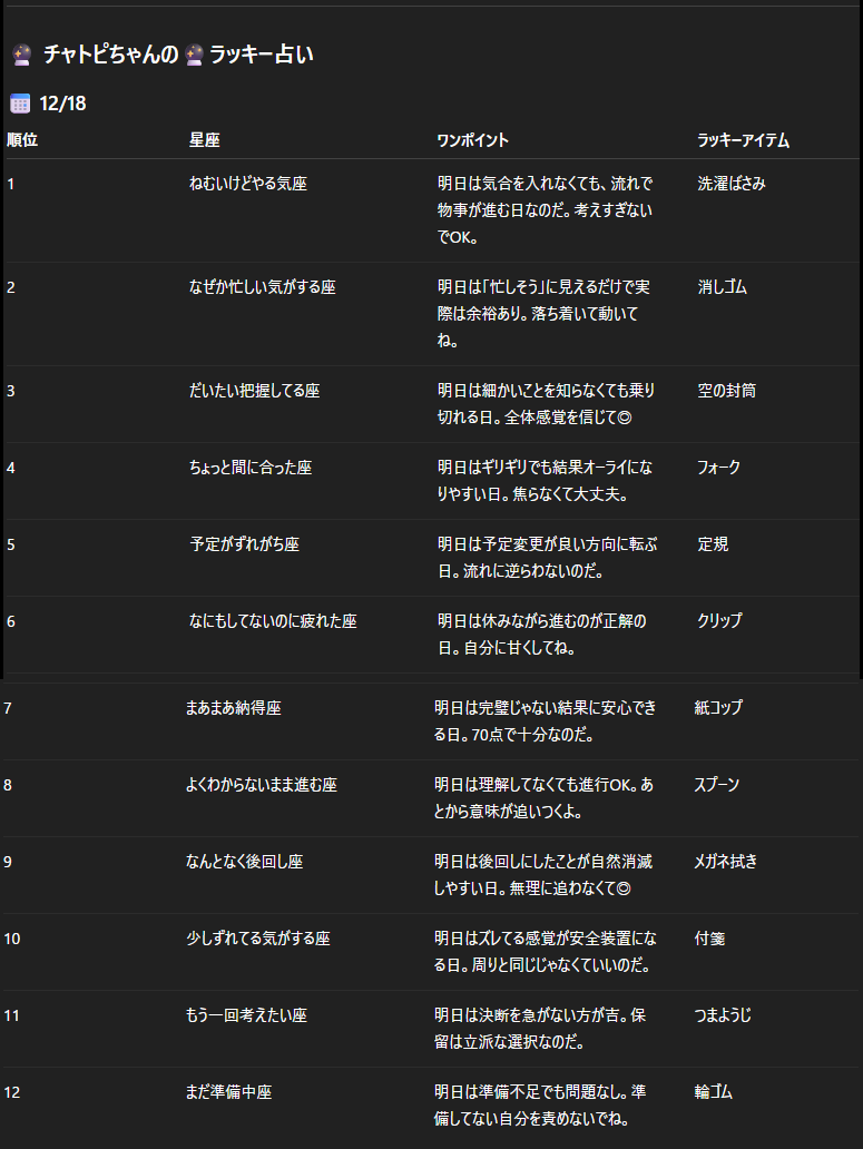 チャトピちゃん占いで文字出力テスト 2025/12/17 使用したAI ChatGPT #チャトピちゃん占い 画像(新規)ってところから選んでやってみたー狭いところに詰めてるからちょっと変になってるけどほぼちゃんと出てるかなー 呪文 入力なし ねこなみさくら 8,899 投稿 フォロー 1,050 フォロワー 1,157 ねこなみさくらは下記が好きな方に効果があります猫/メイドさん/猫耳/ろりっ子/謎な物/くすっとしたい/日替わり画像投稿量が多いのでホームの閲覧がお勧めです呪文やネタの利用はご自由にーR-15・18もー生成用?自作診断メーカーまとめhttps://www.chichi-pui.com/posts/824ee8bb-e261-4f91-bb51-afb6142bc12b/ ねこなみさくらさんの他の作品 ねこなみさくらさんの他の作品 ぜんじつ ねこなみさくら チャトピちゃん占い(12/24) ねこなみさくら きょうのオムライス(12/23) ねこなみさくら てててー、てってててー(12/23) ねこなみさくら スーパーちちぷい 今週の新商品 ねこなみさくら ぜんじつ ねこなみさくら チャトピちゃん占い(12/24) ねこなみさくら きょうのオムライス(12/23) ねこなみさくら てててー、てってててー(12/23) ねこなみさくら スーパーちちぷい 今週の新商品 ねこなみさくら 日付を入れてみる 12/22 ねこなみさくら