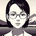 富士山を背景に映る美しい眼鏡女子、
