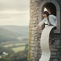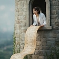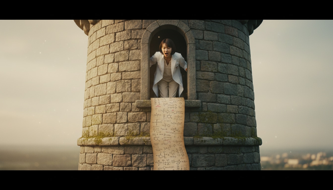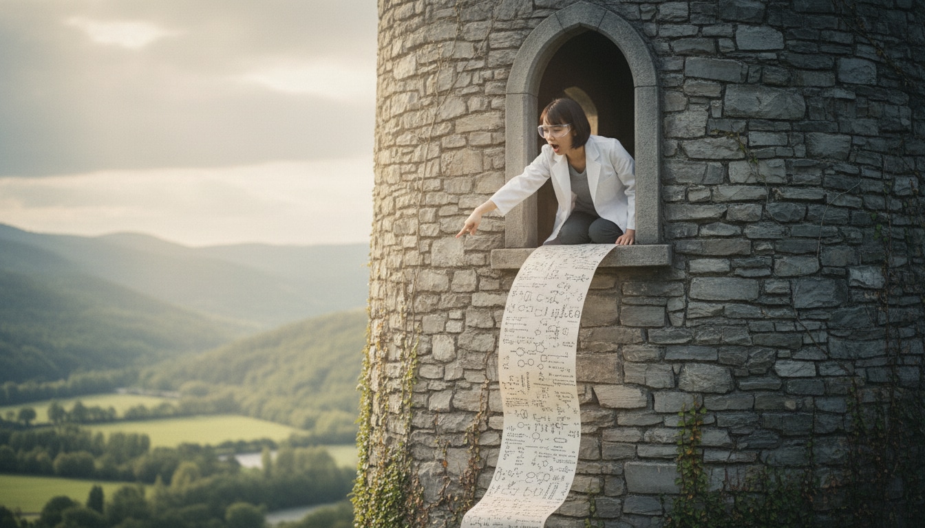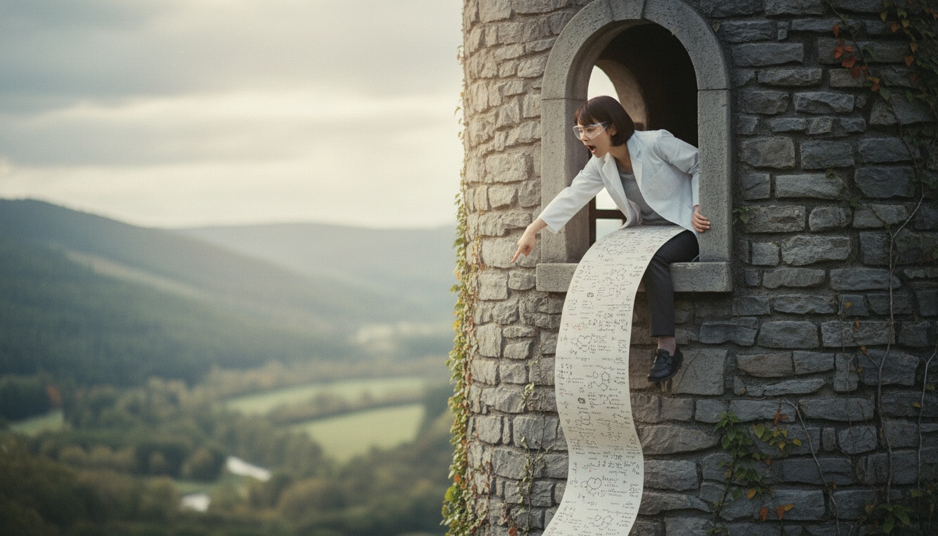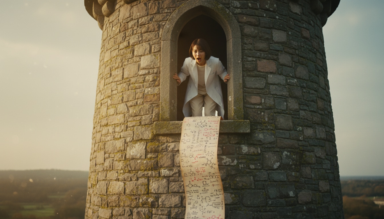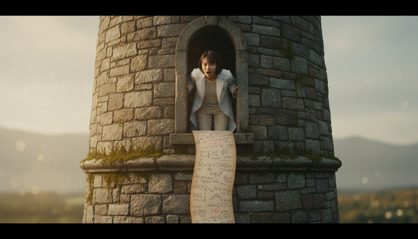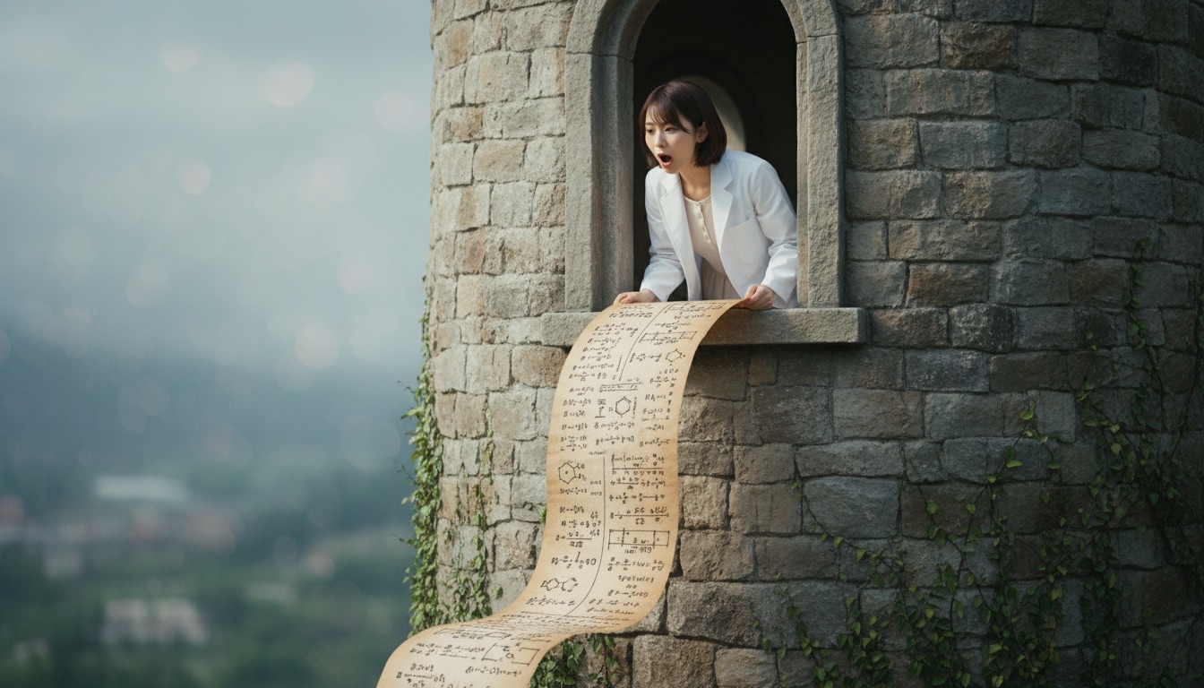 「そこのあなた!計算を手伝って! …え?髪を下ろせ?無理よ、私はボブヘアだもの。それより、この数式の続き、わかる!?」 (塔に幽閉された姫…ではなく、塔の研究室に籠るリケジョ)