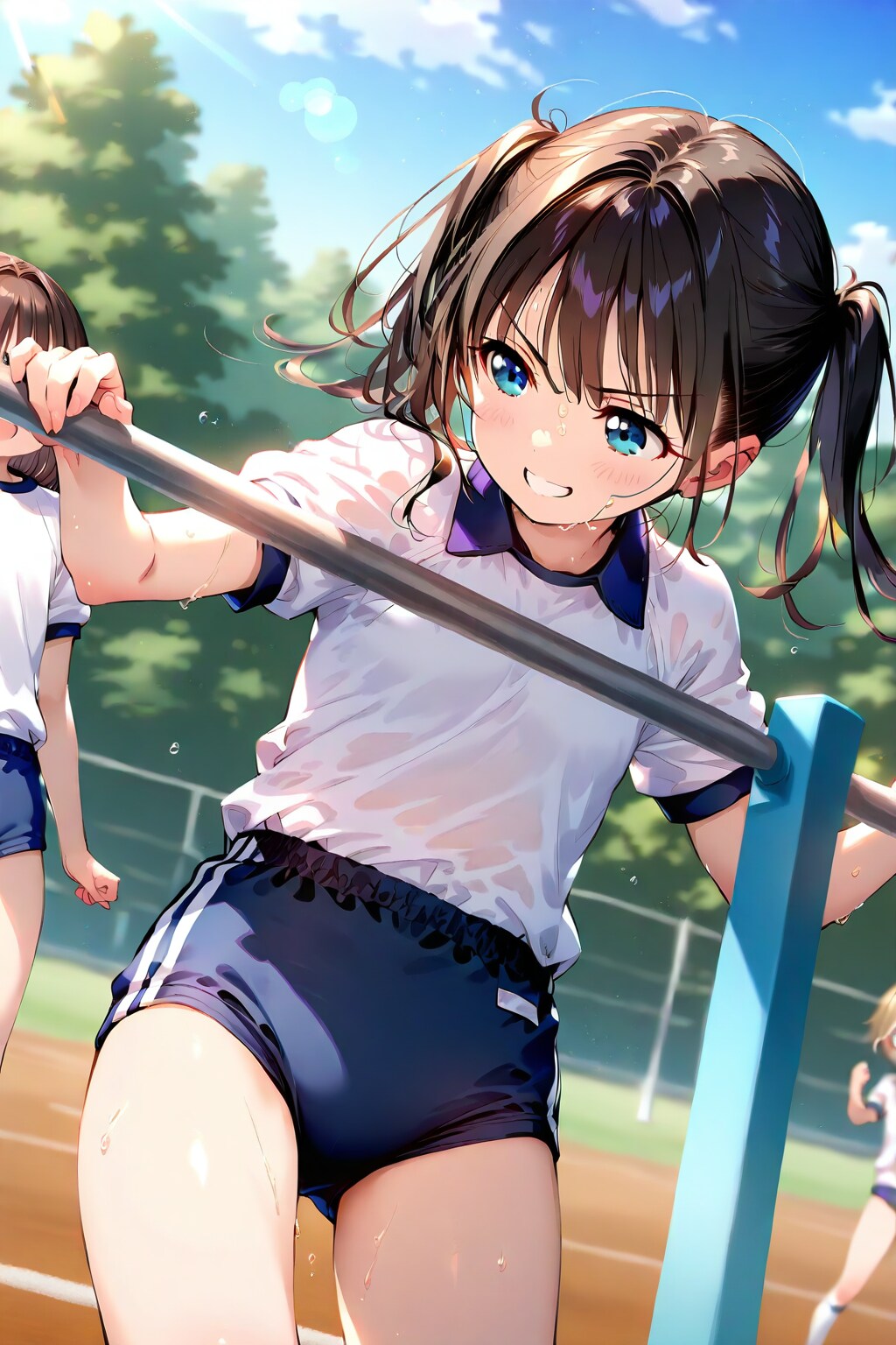 jacket partially removed, heart in eye, burnt clothes, holding fishing rod, kanji, doujin cover, pentagram, tape gag, adjusting headwear, red socks, friends, cloud print, coke-bottle glasses, oral invitation, competition school swimsuit, barbell piercing, gradient legwear, prisoner, blood on breasts, wind chime, carrying over shoulder, tape measure, flaming weapon