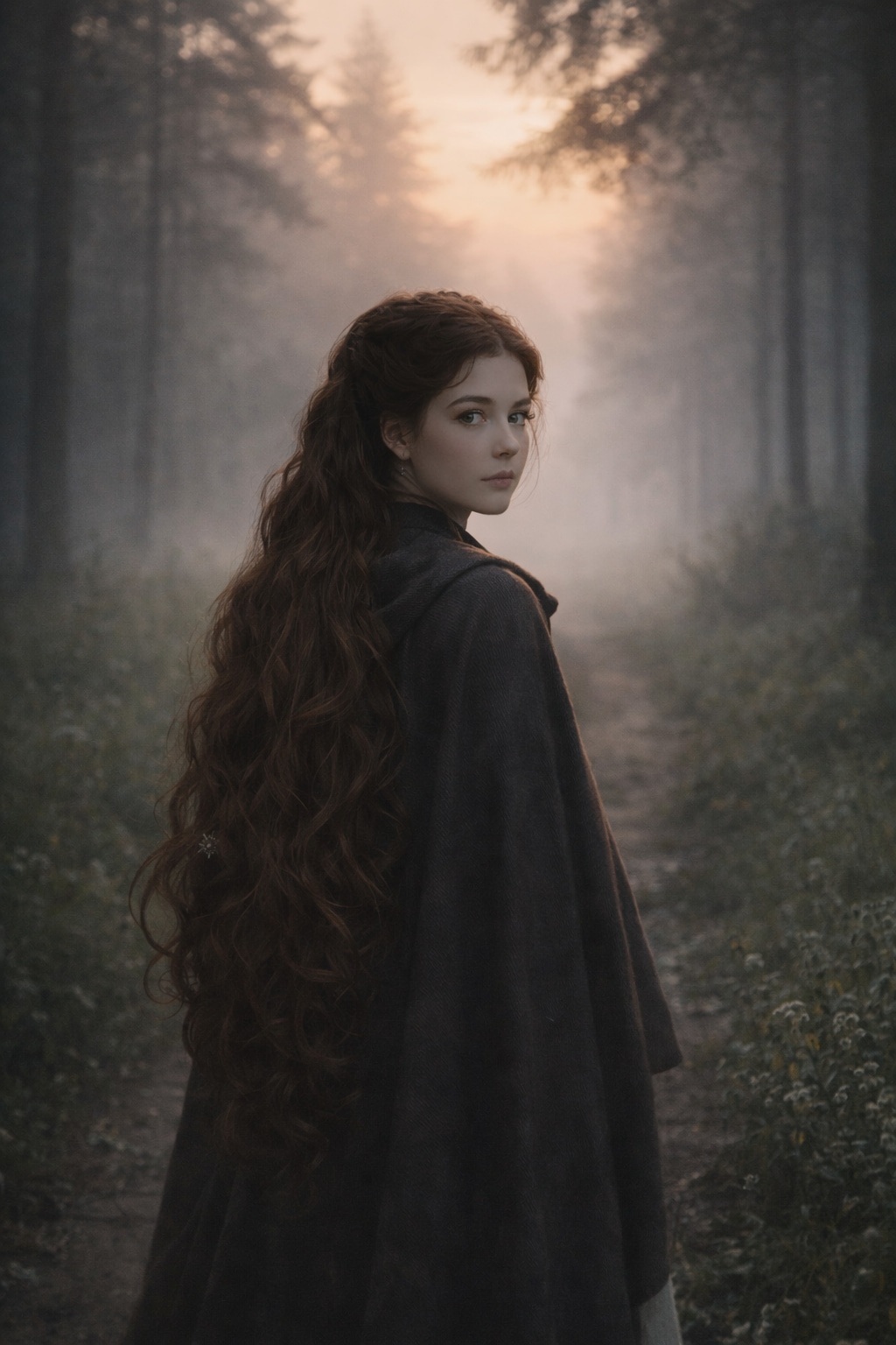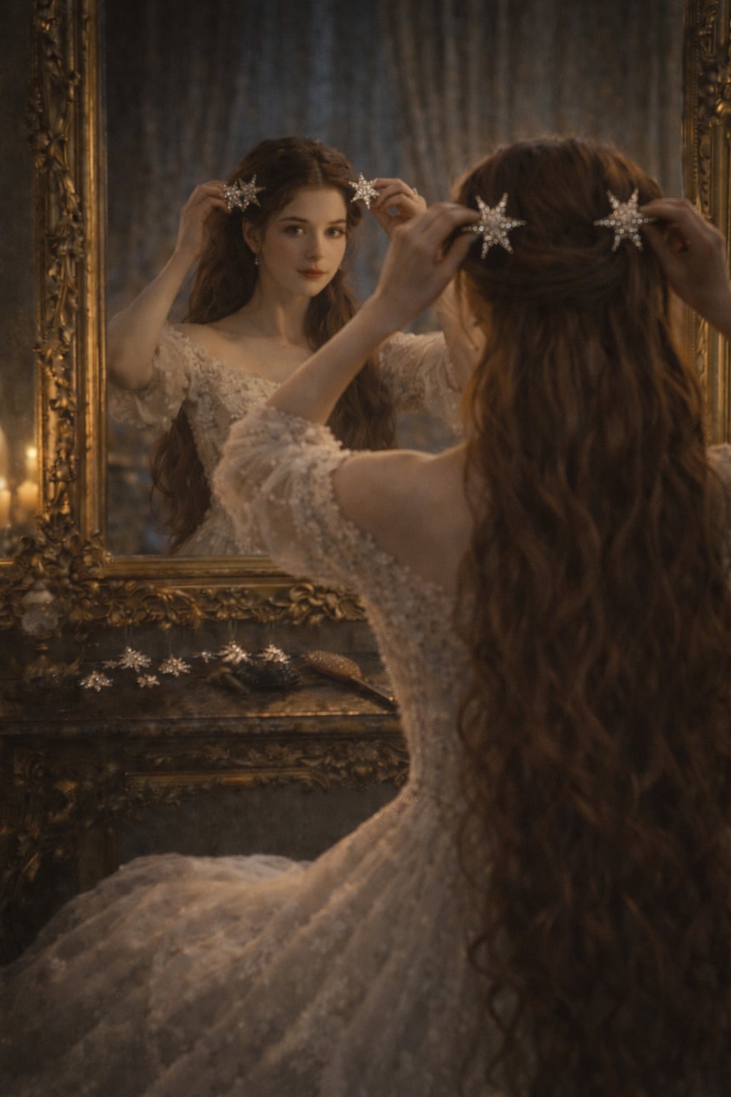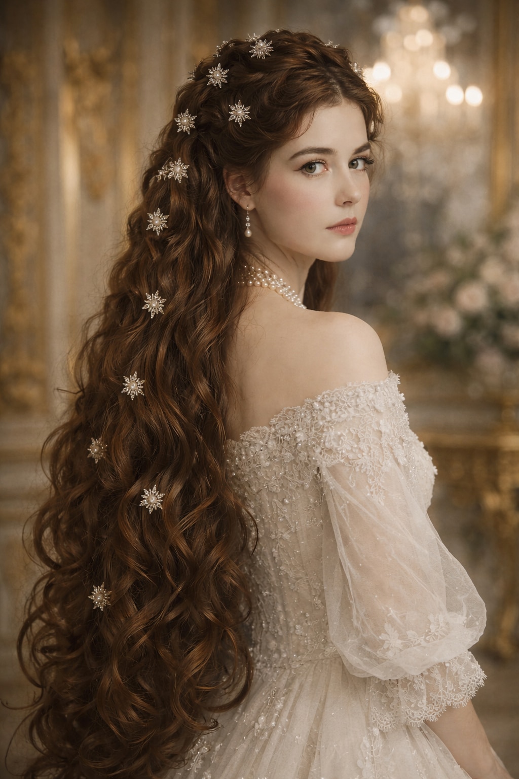 豊かなダークブラウンの髪、美しい肩のライン、ドレス。