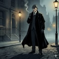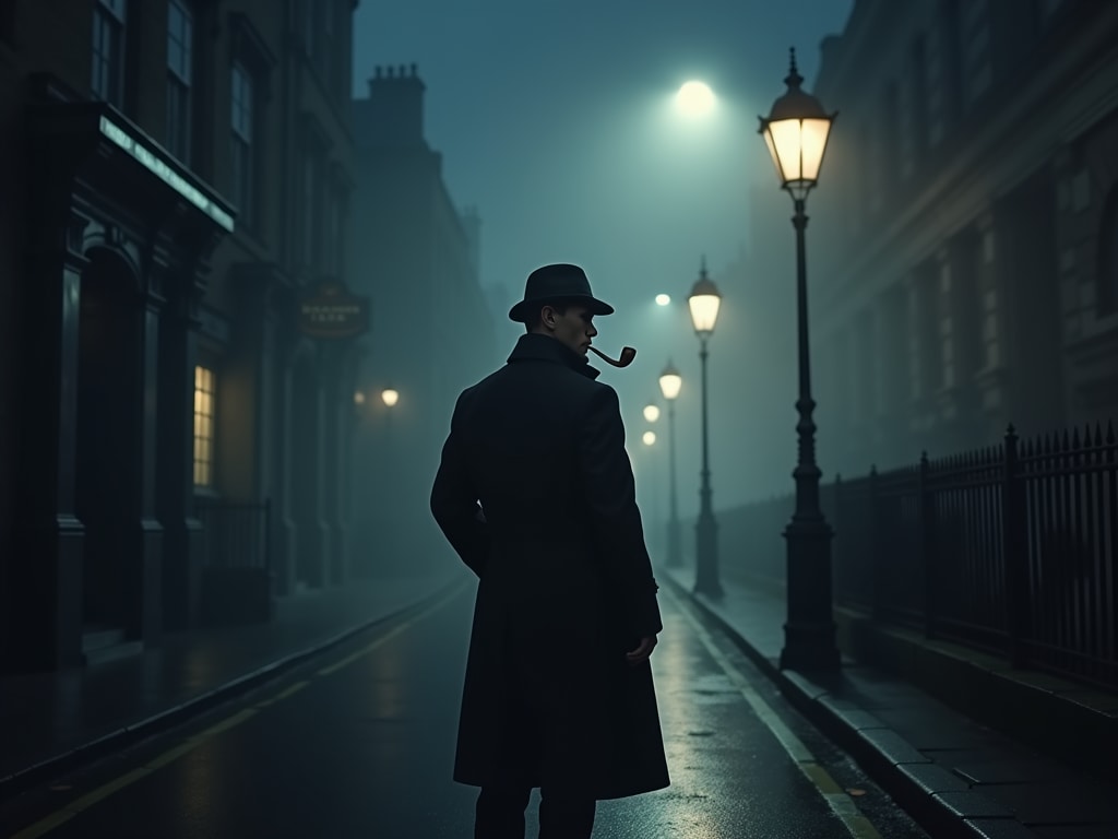 A cinematic, gloomy illustration of Sherlock Holmes standing alone on a fog-shrouded Victorian London street at night, clad in a long black coat and deerstalker hat, pipe in hand. His expression is cold and calculating, yet his eyes hold a faint glimmer of compassion. Dim gas lamps cast long shadows. The stark lighting contrasts with a morally ambiguous atmosphere, creating a mysterious and dramatic mood.