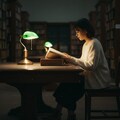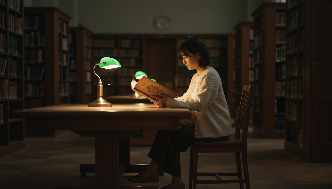 夜の図書館、ページをめくる音だけが響く