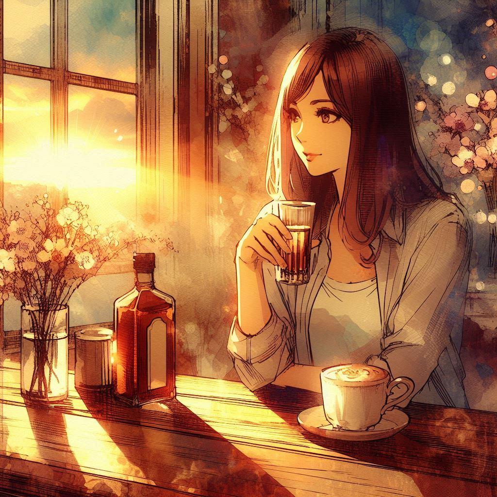 夕暮れの光が、カフェの床に細長く伸びていた。