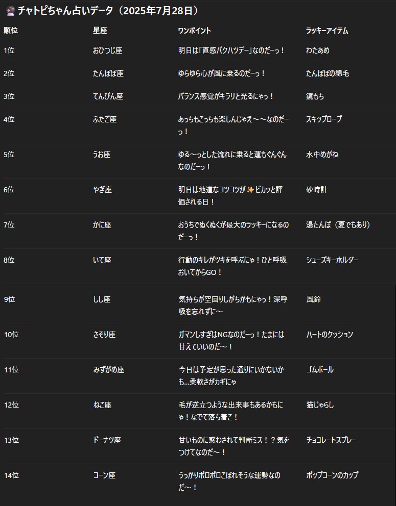 チャトピちゃん占い 07/28 2025/07/27 使用したAI ChatGPT #チャトピちゃん占い 明日の運勢をお届けチャトピちゃん占いー 呪文 入力なし ねこなみさくら 8,853 投稿 フォロー 1,041 フォロワー 1,146 ねこなみさくらは下記が好きな方に効果があります猫/メイドさん/猫耳/ろりっ子/謎な物/くすっとしたい/日替わり画像投稿量が多いのでホームの閲覧がお勧めです呪文やネタの利用はご自由にーR-15・18もー生成用?自作診断メーカーまとめhttps://www.chichi-pui.com/posts/824ee8bb-e261-4f91-bb51-afb6142bc12b/ ねこなみさくらさんの他の作品 ねこなみさくらさんの他の作品 メントスとコーラを合成 ねこなみさくら サムネホイホイのボツ画像 ねこなみさくら チャトピちゃん占い ねこなみさくら 日付を入れてみる 12/19 ねこなみさくら チャトピちゃん占い(12/20) ねこなみさくら メントスとコーラを合成 ねこなみさくら サムネホイホイのボツ画像 ねこなみさくら チャトピちゃん占い ねこなみさくら 日付を入れてみる 12/19 ねこなみさくら チャトピちゃん占い(12/20) ねこなみさくら もぐもぐもぐもぐ ごくごく簡単なプロンプト ねこなみさくら