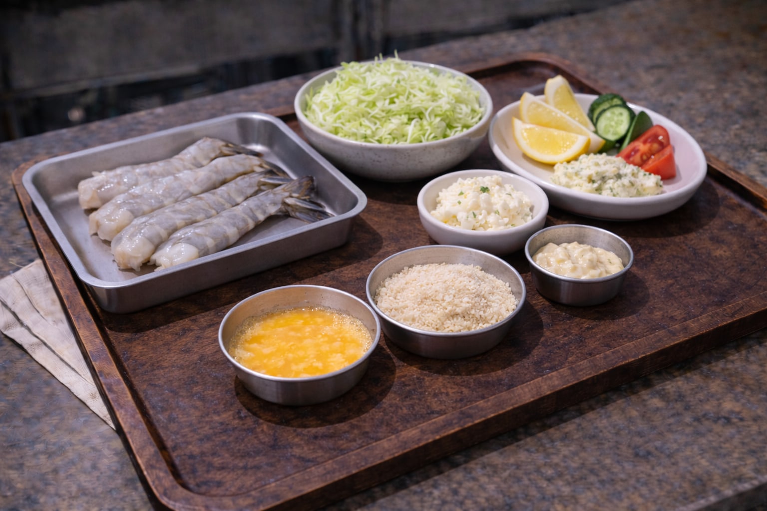 皿の上には、黄金色のエビフライが並ぶ。