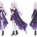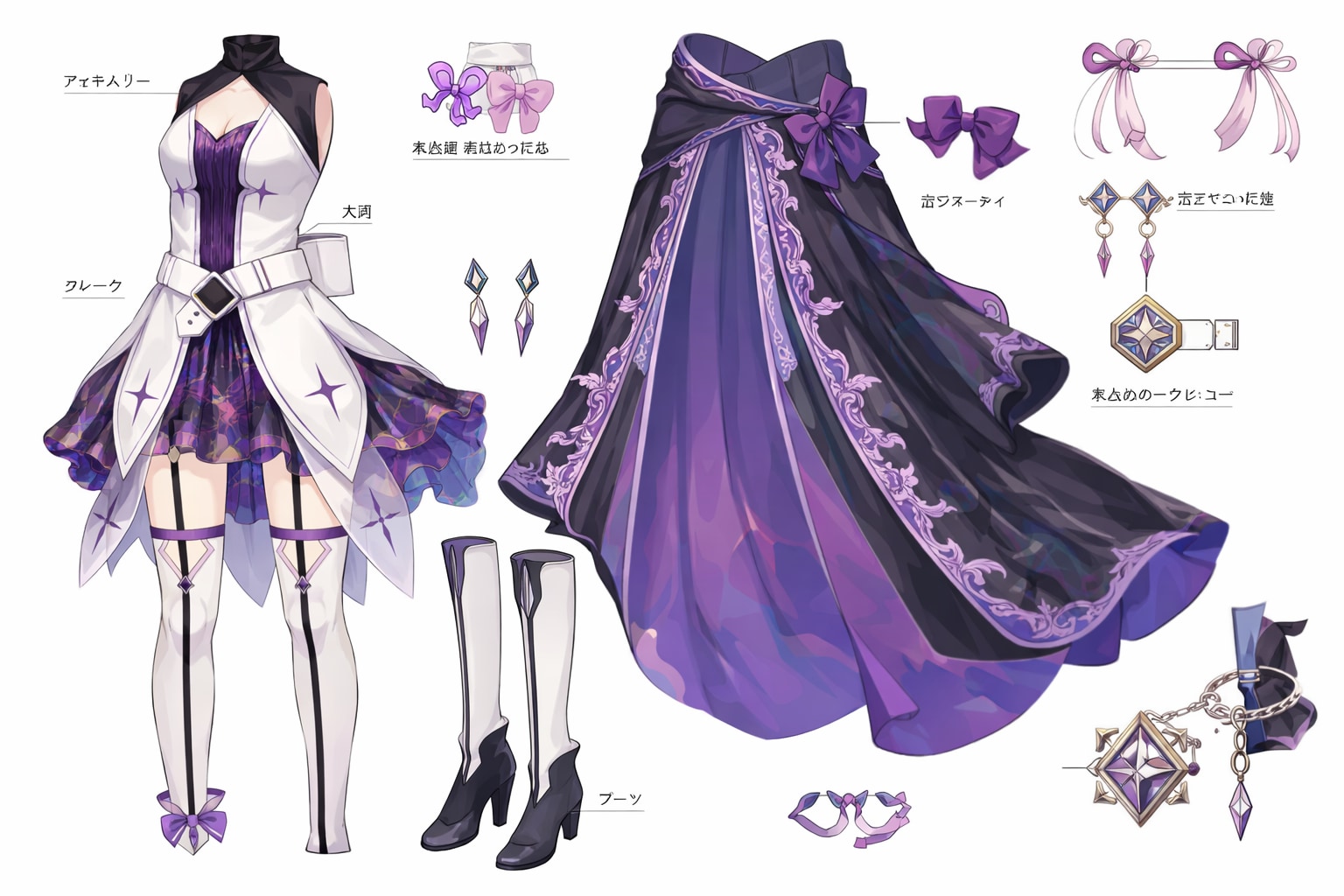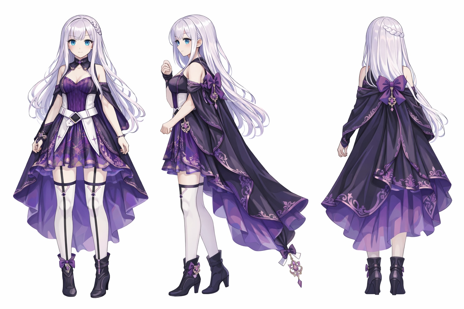 This is a character outfit replacement edit. Use the provided three-view character illustration as the base. Preserve the original character exactly as-is: same anatomy, body proportions, height, silhouette, face, hair, expression, pose, camera angle, and three-view layout (front / side / back). Do not retain, reuse, or reference any elements of the original outfit. The character’s appearance should reflect only the new outfit described below. Replace the character’s outfit entirely using ONLY the clothing, footwear, and accessories shown in the provided design sheet. Accurately apply all of the following from the design sheet: - the purple-and-black dress with a layered skirt and ornate decorative patterns - the long, flowing cape with decorative trim and bow - thigh-high stockings with garter-style details - heeled boots - all ribbons, bows, belts, jewelry, and accessories exactly as shown Do not add, invent, simplify, or omit any items. Do not merge or blend with any previous outfit design. Outfit replacement only. Clean white or neutral background. High-detail anime-style character design sheet quality.