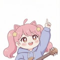 画像生成。この絵の楽器を抱えている場面のちびちゃんが右腕を挙げて真上を指している一枚絵。白背景。