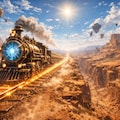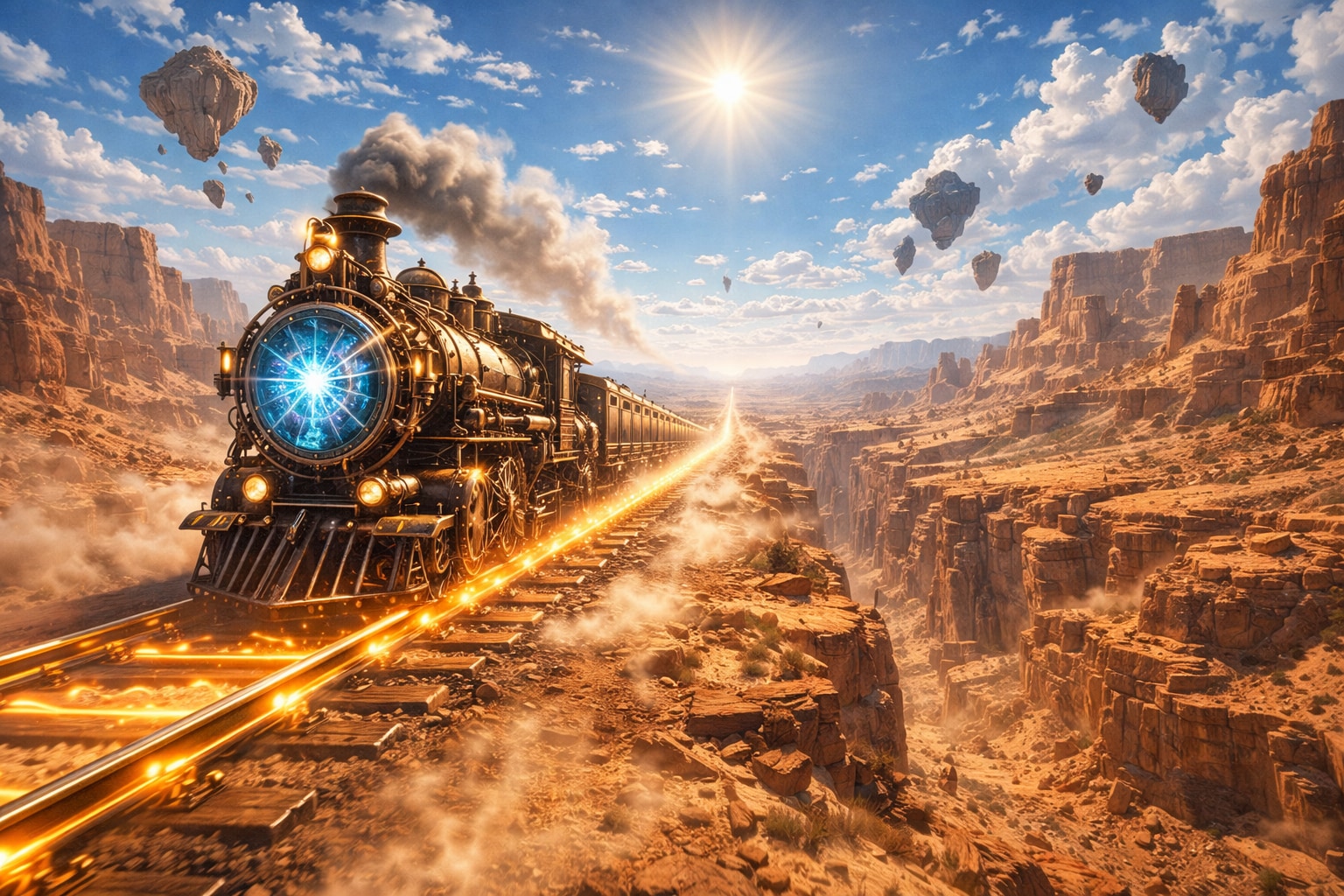 果てしなく続く赤茶けた大渓谷を、一本の魔導レールが真っ直ぐに貫いている。クリスタルを動力源とした超高速の蒸気機関車が、地響きを立てて砂塵の中を駆け抜ける。上空には重力魔法によって静止した浮遊岩の駅が点在し、地上の荒野との対比を描き出す。強烈な陽光と陽炎が揺れる中、フロンティア精神と高度な魔術が共存する、果てしない地平線の光景である。