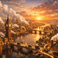 夕暮れに染まるレンガ造りの巨大な産業都市を一望する。至る所に巨大な真鍮の歯車とピストンが組み込まれ、都市そのものが一つの生き物のように脈動している。ガラス管の中を流れる黄金色の液体魔導燃料が、薄暗い街路を怪しく照らし出す。空を覆う黒煙と白い蒸気の中で、荘厳な時計塔がこの大陸の圧倒的な技術力を誇示している。