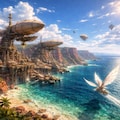 鮮やかなターコイズブルーの海と、直立する赤い断崖のコントラストが美しい湾岸風景である。崖に刻み込まれた巨大な立体港には、白い絹の翼を広げた「魔導飛行帆船」が数多く行き交う。大陸を吹き抜ける強風をエネルギーに変えるため、巨大な風力タービンが鎮座し、飛沫と魔力が混ざり合う。自由と飛翔の空気感に満ちた、開放的なパノラマである。