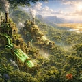 鬱蒼とした熱帯雨林の奥深く、古代の石造寺院と巨大な蒸気掘削機が一体化した異様な光景である。機械のパイプラインには、植物の生命力を抽出した緑色のバイオ・エーテルが脈動しながら流れ、周囲の植物を異常に成長させている。黄金のステップ地帯に生まれたオアシスを背景に、自然の生命力と機械の破壊的な力が奇妙な調和を見せる。陽光が木漏れ日となって差し込む、高密度な生命の風景である。