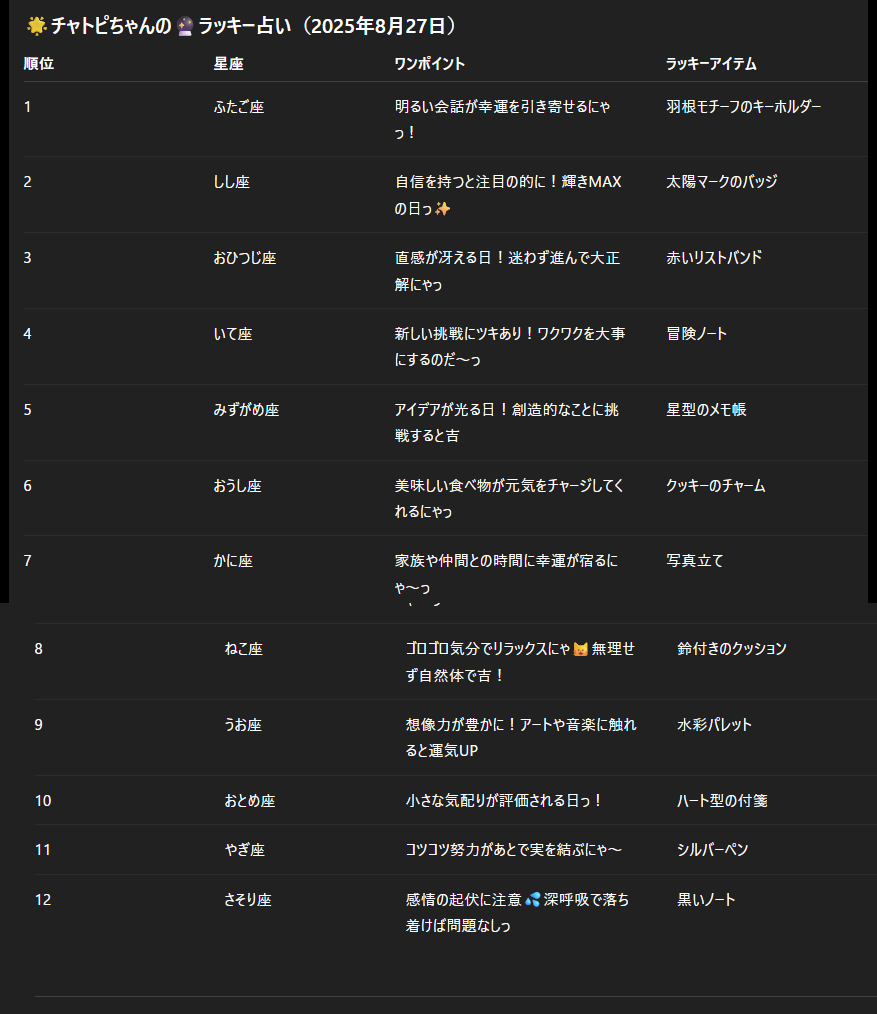 08/27のチャトピちゃん占い 2025/08/26 使用したAI ChatGPT #チャトピちゃん占い 明日の運勢をお届けーチャトピちゃん占いー 呪文 入力なし ねこなみさくら 9,600 投稿 フォロー 1,176 フォロワー 1,285 ねこなみさくらは下記が好きな方に効果があります猫/メイドさん/猫耳/ろりっ子/謎な物/くすっとしたい/日替わり画像投稿量が多いのでホームの閲覧がお勧めです呪文やネタの利用はご自由にーR-15・18もー↓いろいろまとめーhttps://www.chichi-pui.com/posts/7835be9f-d077-48bb-b2c8-bbcb1003bf19/ ねこなみさくらさんの他の作品 ねこなみさくらさんの他の作品 チャトピちゃん占い(02/14) ねこなみさくら ちゅーっ ねこなみさくら 日付を入れてみる 02/13 ねこなみさくら きょうのこはるさん2 ねこなみさくら きょうのオムライス(02/13) ねこなみさくら チャトピちゃん占い(02/14) ねこなみさくら ちゅーっ ねこなみさくら 日付を入れてみる 02/13 ねこなみさくら きょうのこはるさん2 ねこなみさくら きょうのオムライス(02/13) ねこなみさくら てててー、てってててー(02/13) ねこなみさくら