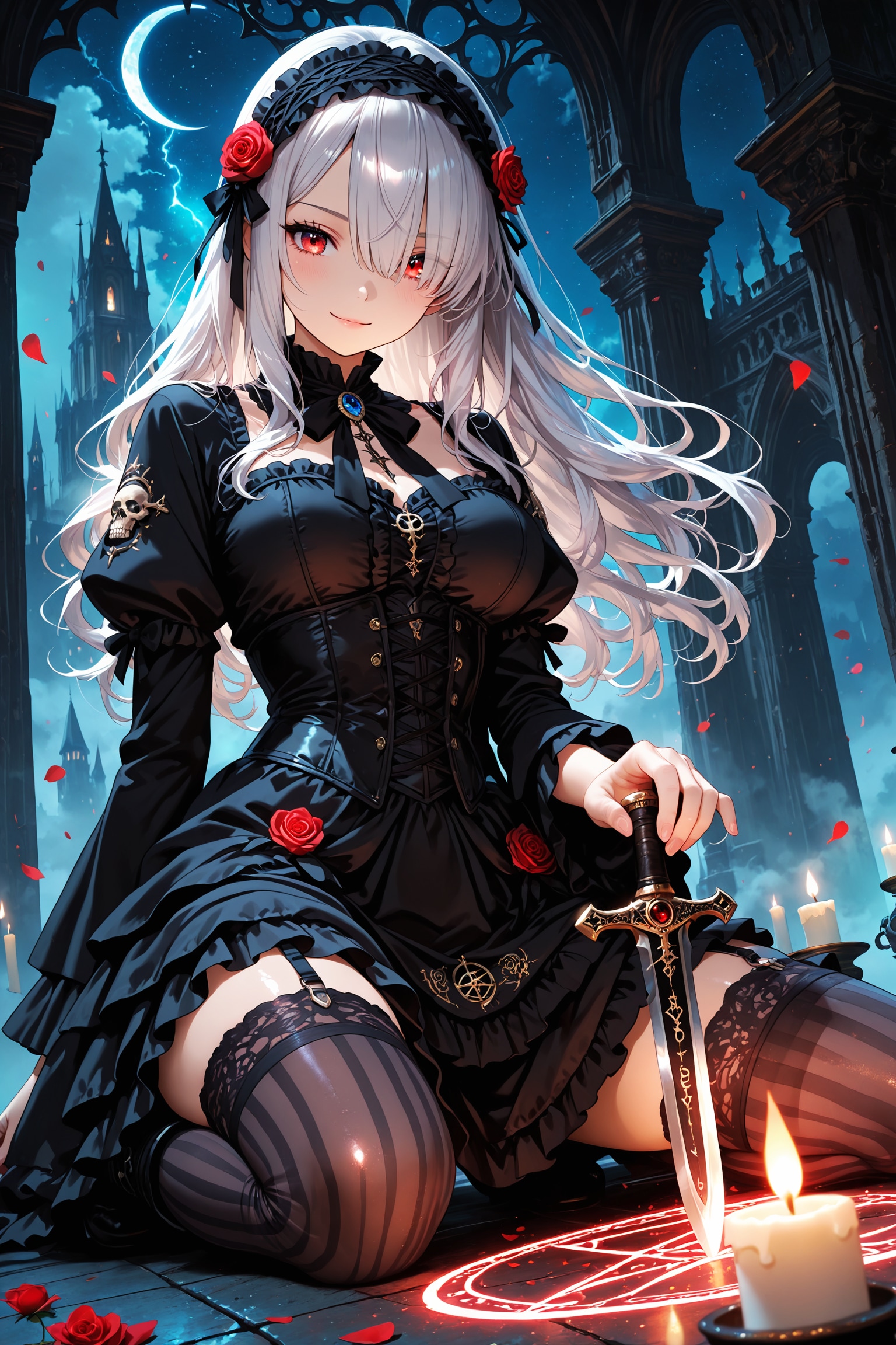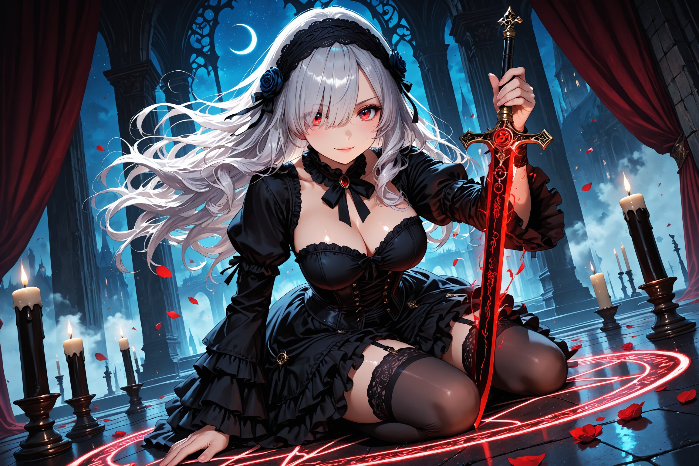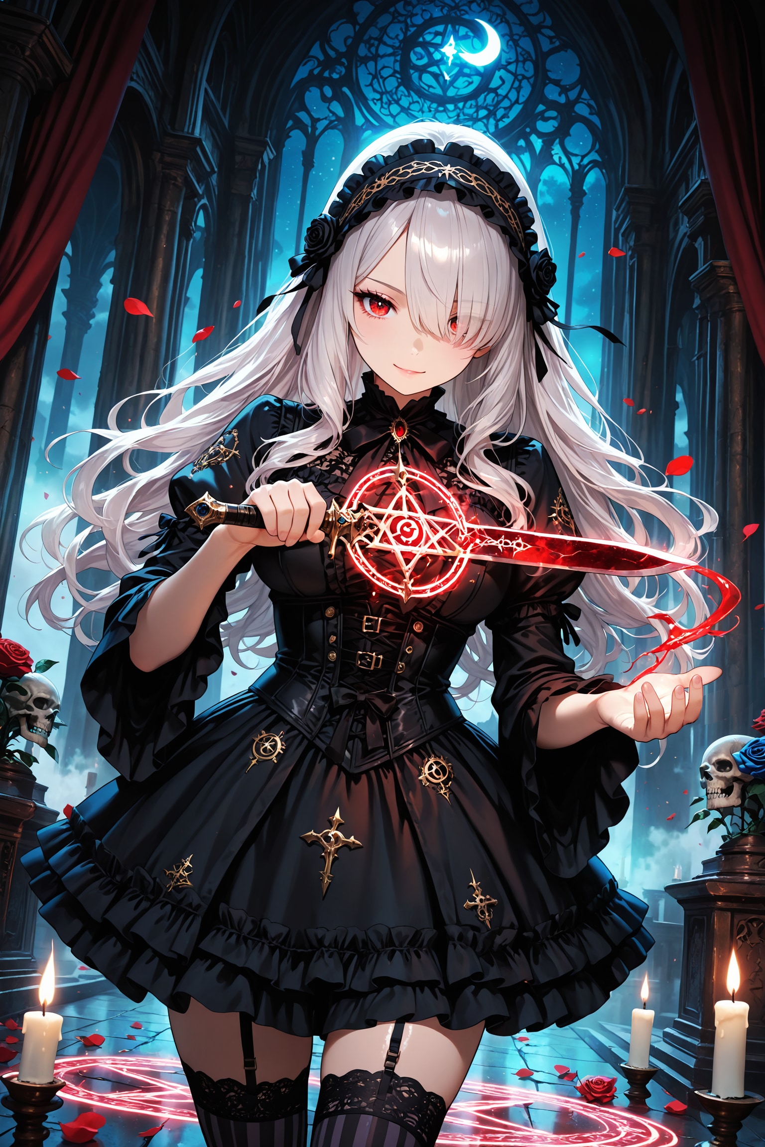 蝋燭の灯りに照らされた部屋には、黒と紅の魔法陣。中心に佇む少女が、短剣を持ったまま、微笑んでいた。