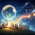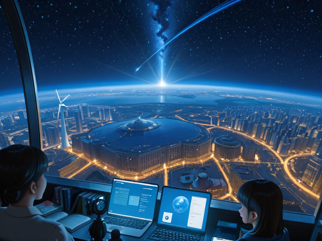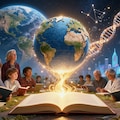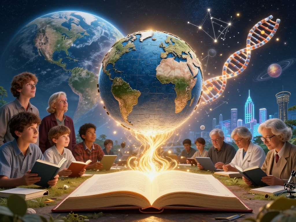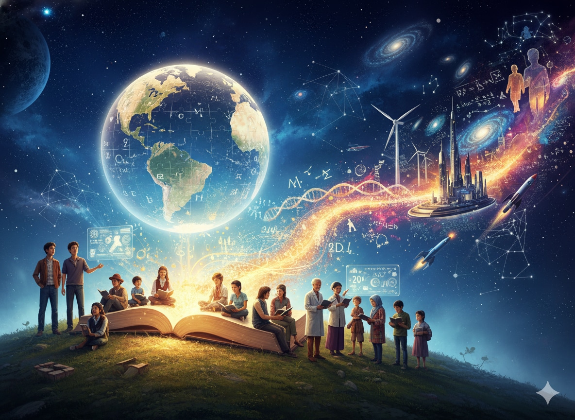 Masterpiece, Best Quality, Amazing Quality, Very Aesthetic, High Resolution, Ultra-Detailed, Absurdres, Newest, Scenery, 3D, Rendered, General, multiple_people, group, diverse_group, men, women, child, elderly_person, scientist, student, book, open_book, glowing_book, knowledge, education, learning, tablet, laptop, microscope, wikipedia, wikipedia_logo, wikipedia_globe, floating_object, symbolism, founders, three_men, young_adults, smiling, looking_forward, future, futuristic_city, cityscape, space, earth, planet, cosmos, starry_sky, constellation, human_silhouette, science, dna, astronomy, mathematics, technology, renewable_energy, wind_turbine, space_shuttle, astronaut, light_trail, glowing_light, golden_light, energy_flow, sparkles, hope, optimism, humanity, democracy, free_knowledge, collective_intelligence, wide_shot, panoramic, landscape, cinematic_lighting, dramatic_lighting, high_detail, ultra_high_resolution, painterly, illustration, Cinematic_Lighting, BREAK, Depth_of_Field, Volumetric_Lighting,