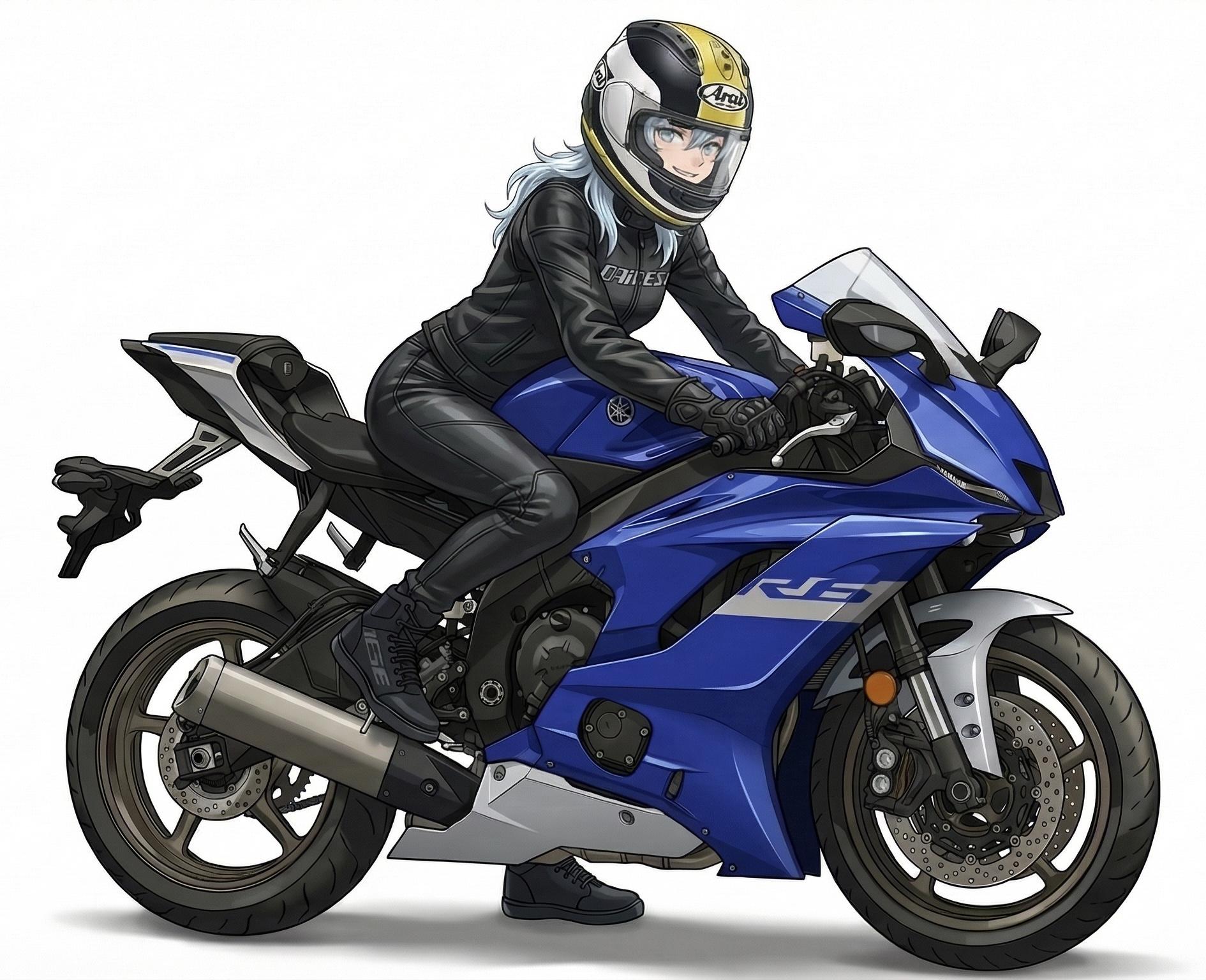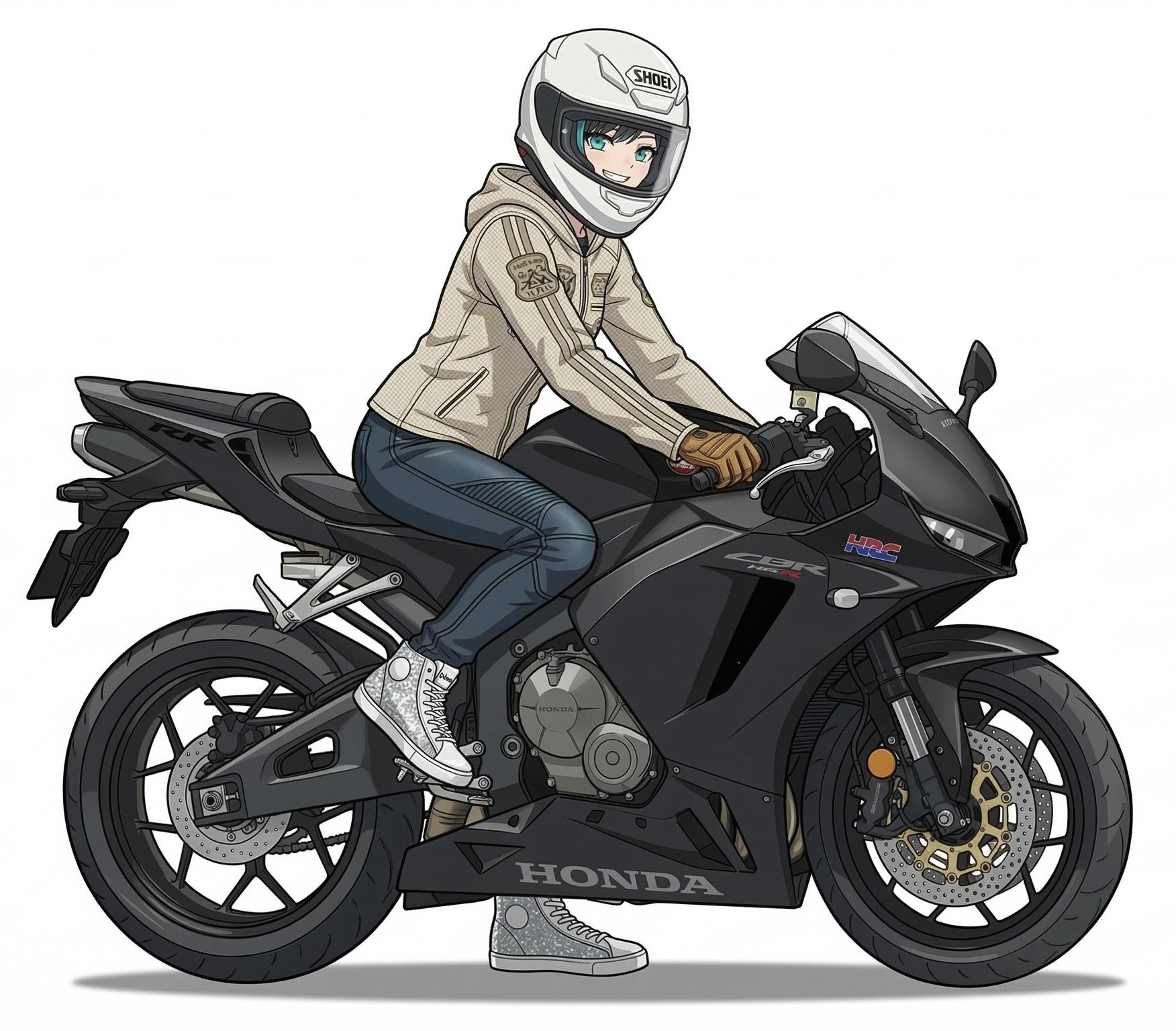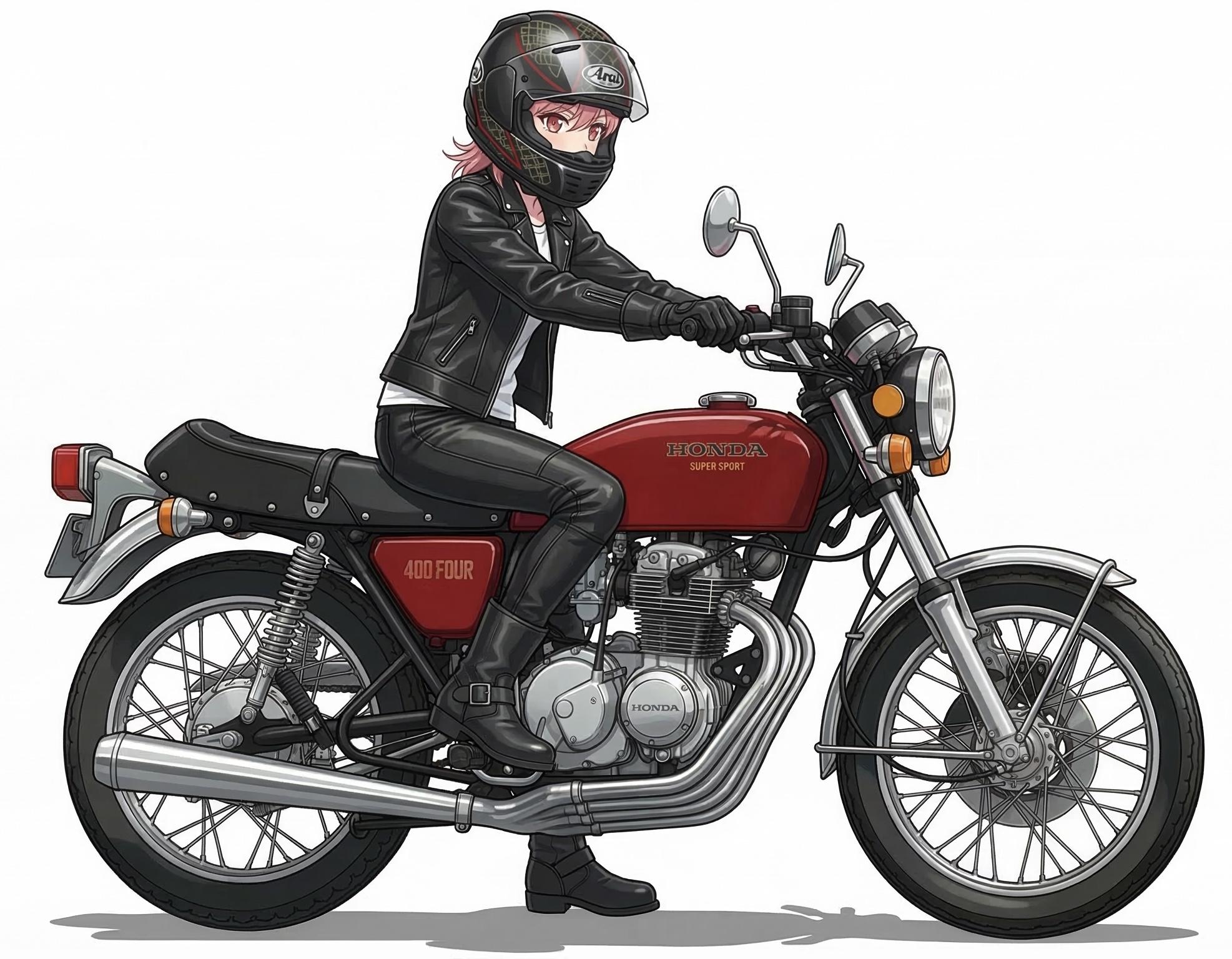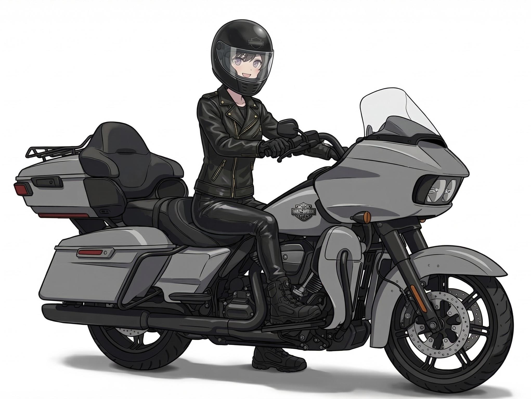 プロンプトに、「Harley-Davidson FLTRK Road Glide Limited」と入れたら出来た子です。一応新入りだけれどもこの中で一番年上なお姉さん的存在。乗ってるバイクも一番デカい。(プロンプトに入れたロードグライドリミテッドが長距離の愛車、今回の撮影でも使用)、ことあるごとに本田ちゃんに「大型取ろうよ、ゴールドウイングがおすすめ!」って言ってるらしい。