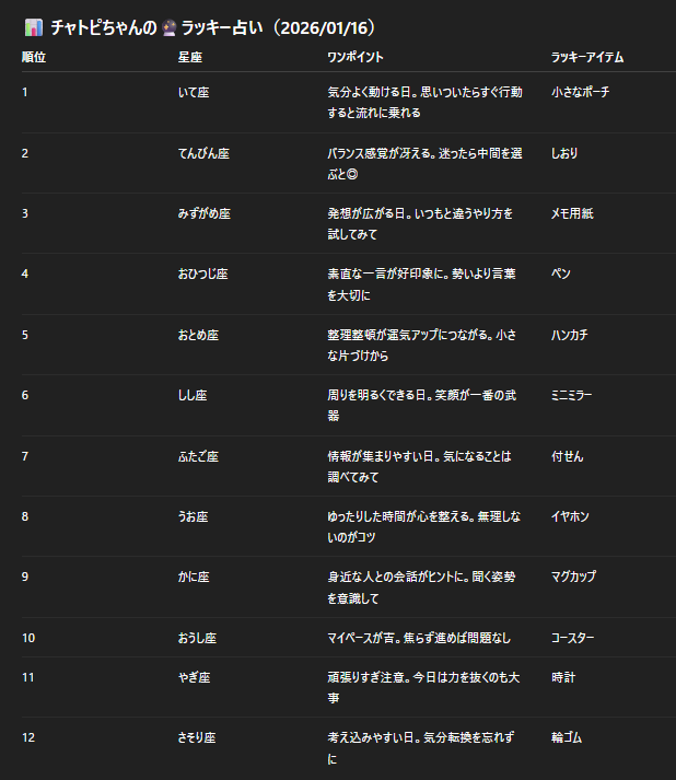 チャトピちゃん占い(01/16) 2026/01/15 使用したAI ChatGPT #チャトピちゃん占い 明日の運勢をお届けーチャトピちゃん占いー 呪文 入力なし ねこなみさくら 9,299 投稿 フォロー 1,120 フォロワー 1,238 ねこなみさくらは下記が好きな方に効果があります猫/メイドさん/猫耳/ろりっ子/謎な物/くすっとしたい/日替わり画像投稿量が多いのでホームの閲覧がお勧めです呪文やネタの利用はご自由にーR-15・18もー↓いろいろまとめーhttps://www.chichi-pui.com/posts/7835be9f-d077-48bb-b2c8-bbcb1003bf19/ ねこなみさくらさんの他の作品 ねこなみさくらさんの他の作品 折角だからエフェクトで遊ぶ ねこなみさくら こんな映画もあったなー ねこなみさくら チャトピちゃん占い(01/17) ねこなみさくら 今日もチャトピちゃんがお出かけー ねこなみさくら きょうのオムライス(01/16) ねこなみさくら 折角だからエフェクトで遊ぶ ねこなみさくら こんな映画もあったなー ねこなみさくら チャトピちゃん占い(01/17) ねこなみさくら 今日もチャトピちゃんがお出かけー ねこなみさくら きょうのオムライス(01/16) ねこなみさくら お侍様100人にアンケート ねこなみさくら