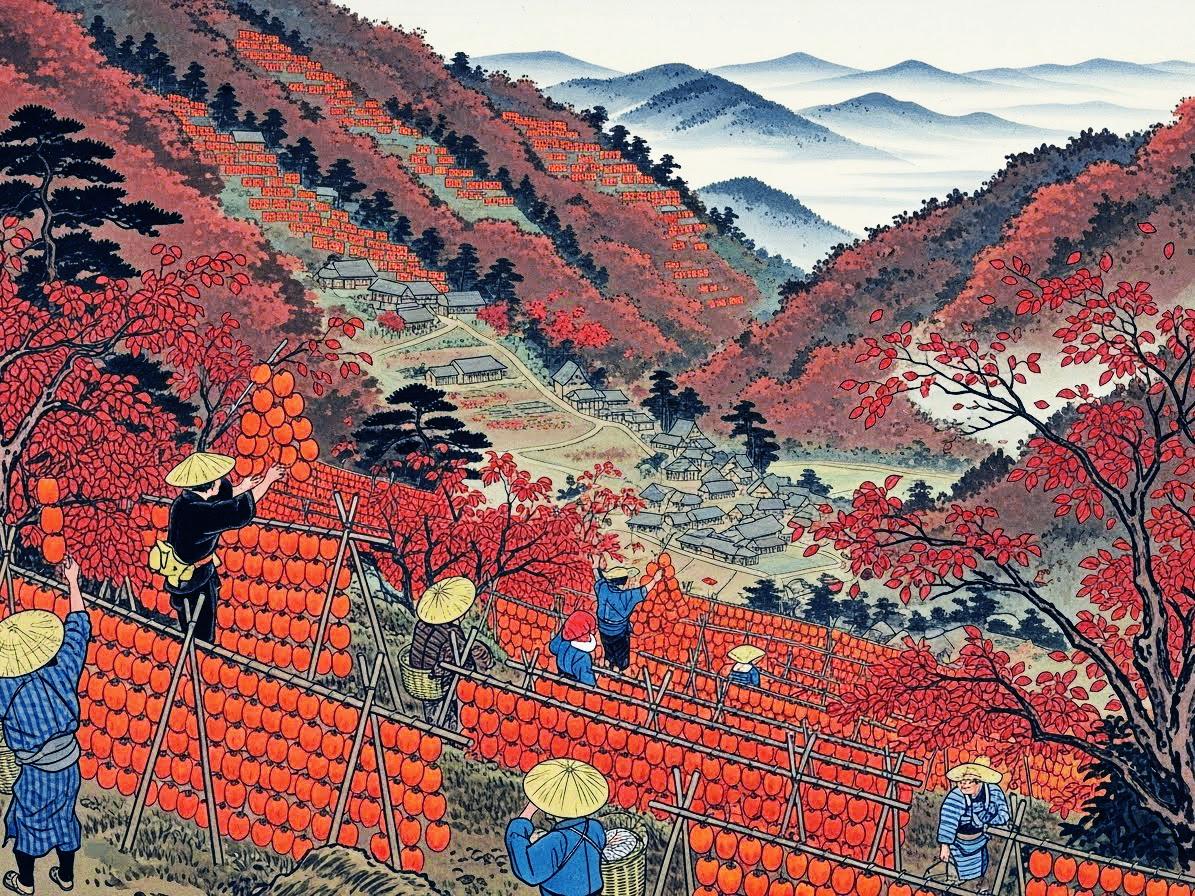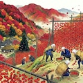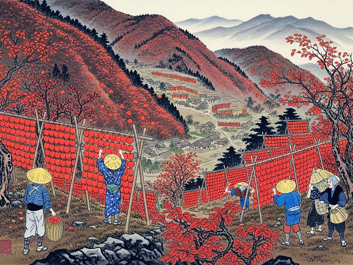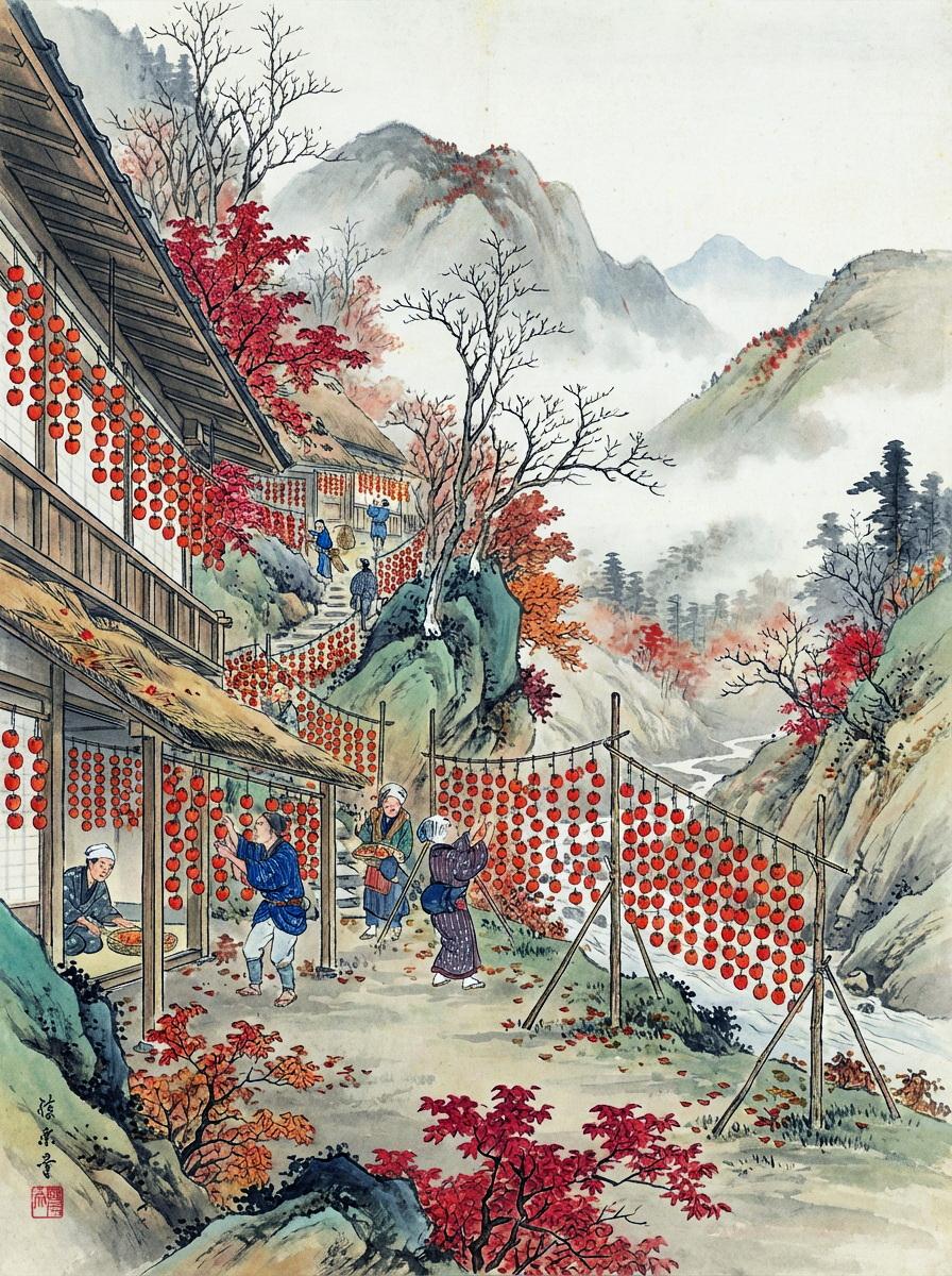 日本画と指定すると昔の風景を描く傾向がどのAIさんにもあるようで、こちらの絵も例に漏れません。現在は合理化・システム化がすすんでおり、もっと大量かつ画一的に柿が干されている眺めは壮観です。