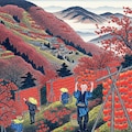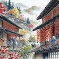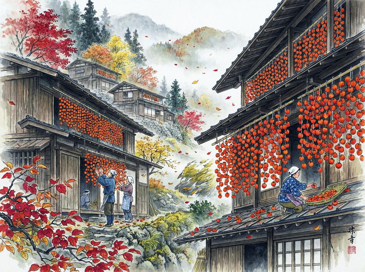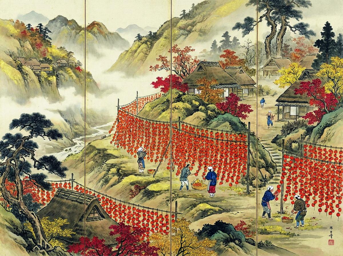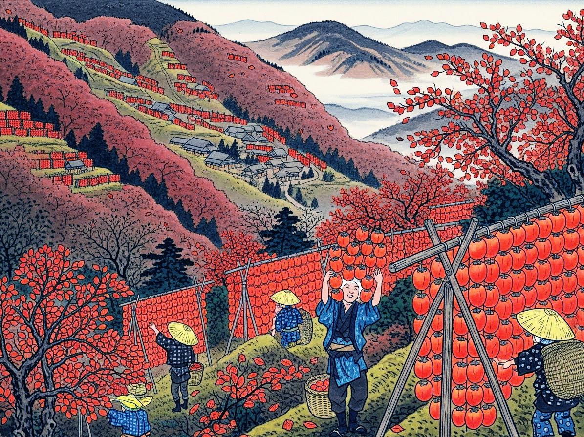 日本画と指定すると昔の風景を描く傾向がどのAIさんにもあるようで、こちらの絵も例に漏れません。現在は合理化・システム化がすすんでおり、もっと大量かつ画一的に柿が干されている眺めは壮観です。