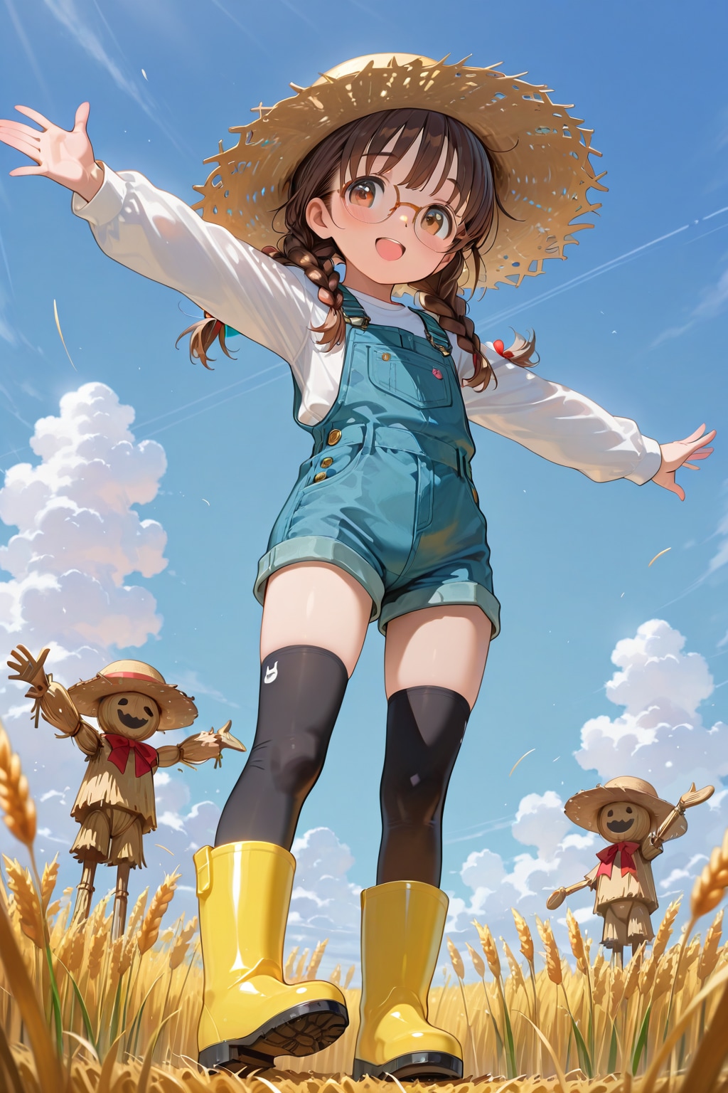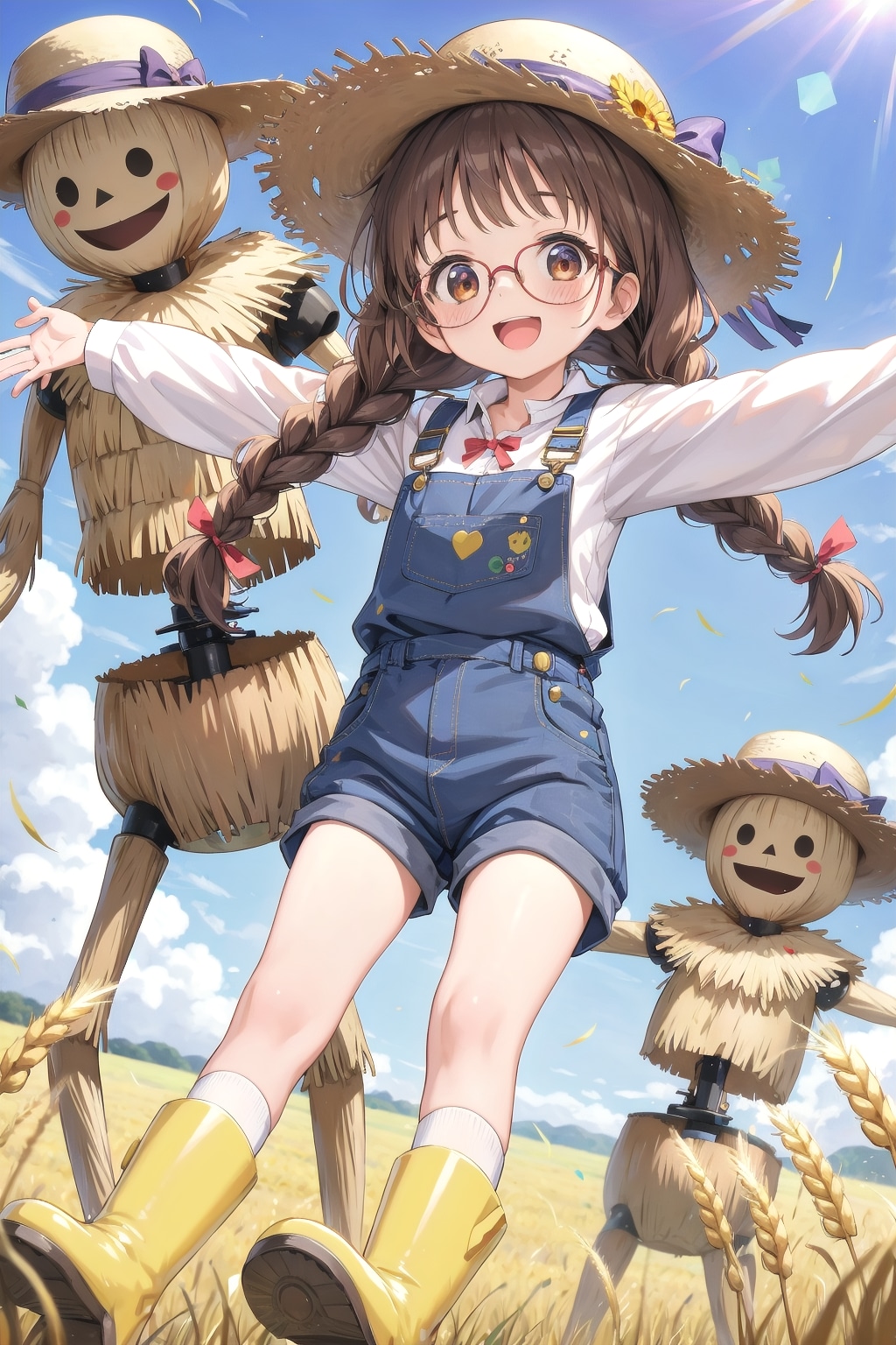 前の案山子企画投稿が案山子を眼鏡三つ編みにするものでしたが、今度は眼鏡三つ編みっ子の委員長ちゃんが案山子に扮するというかポーズをとってるって画像になります。