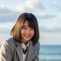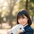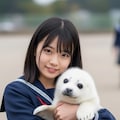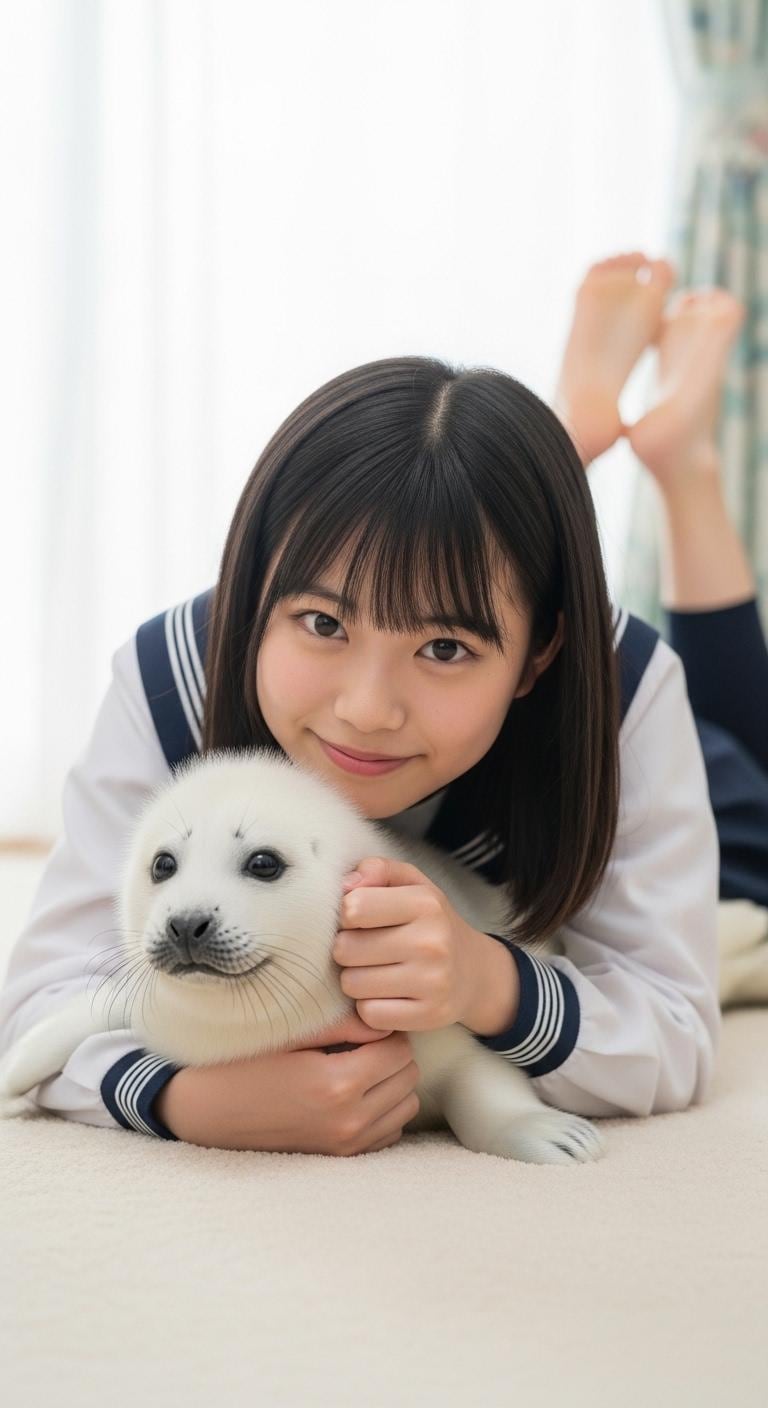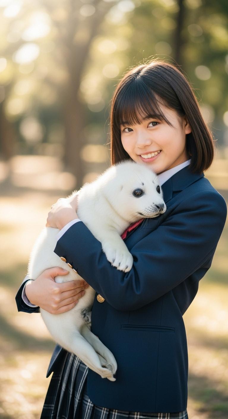 真っ白なアザラシの赤ちゃんを抱えた日本人の可愛い女子中学生のリアルフォトを作って。
