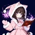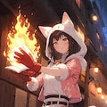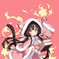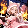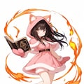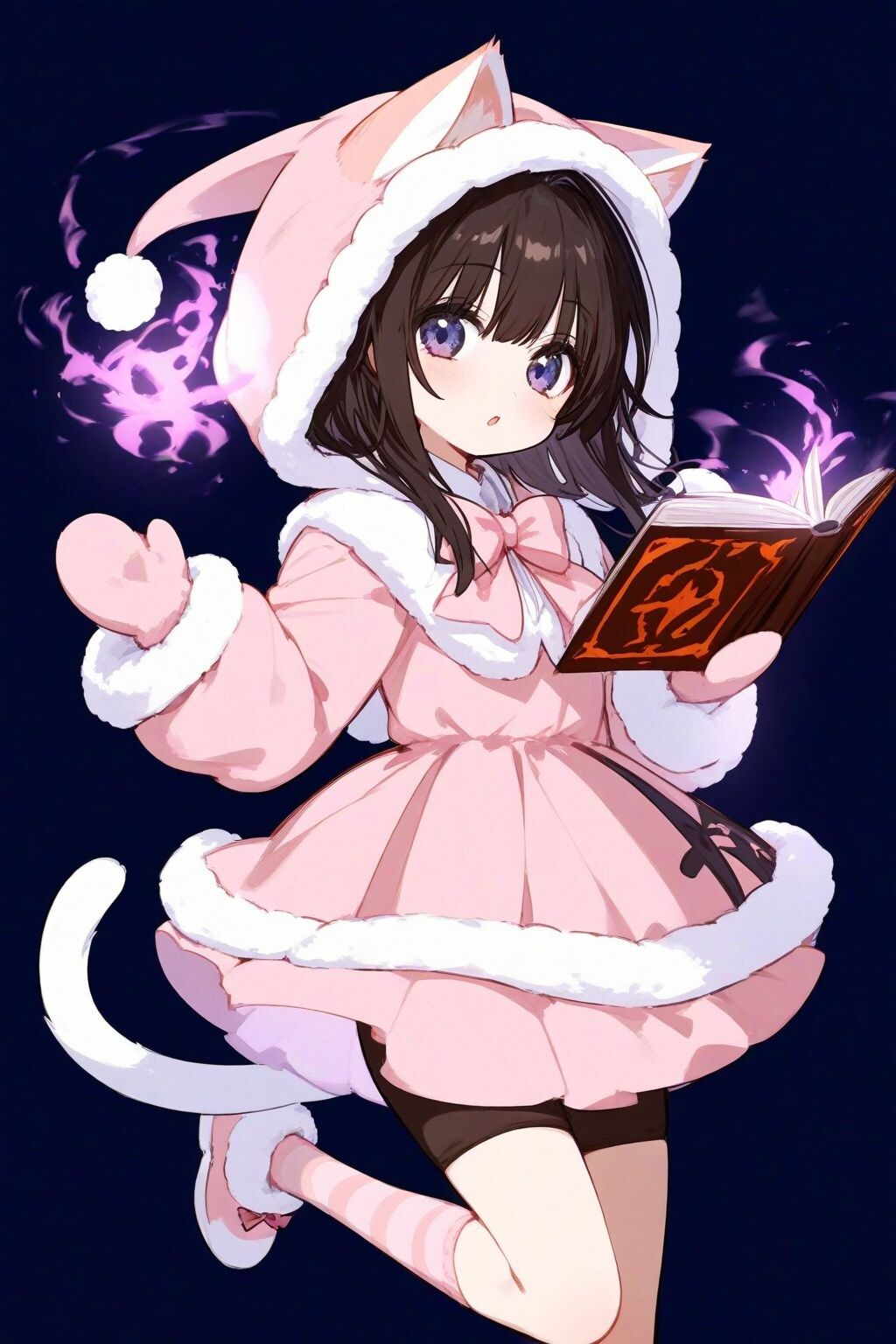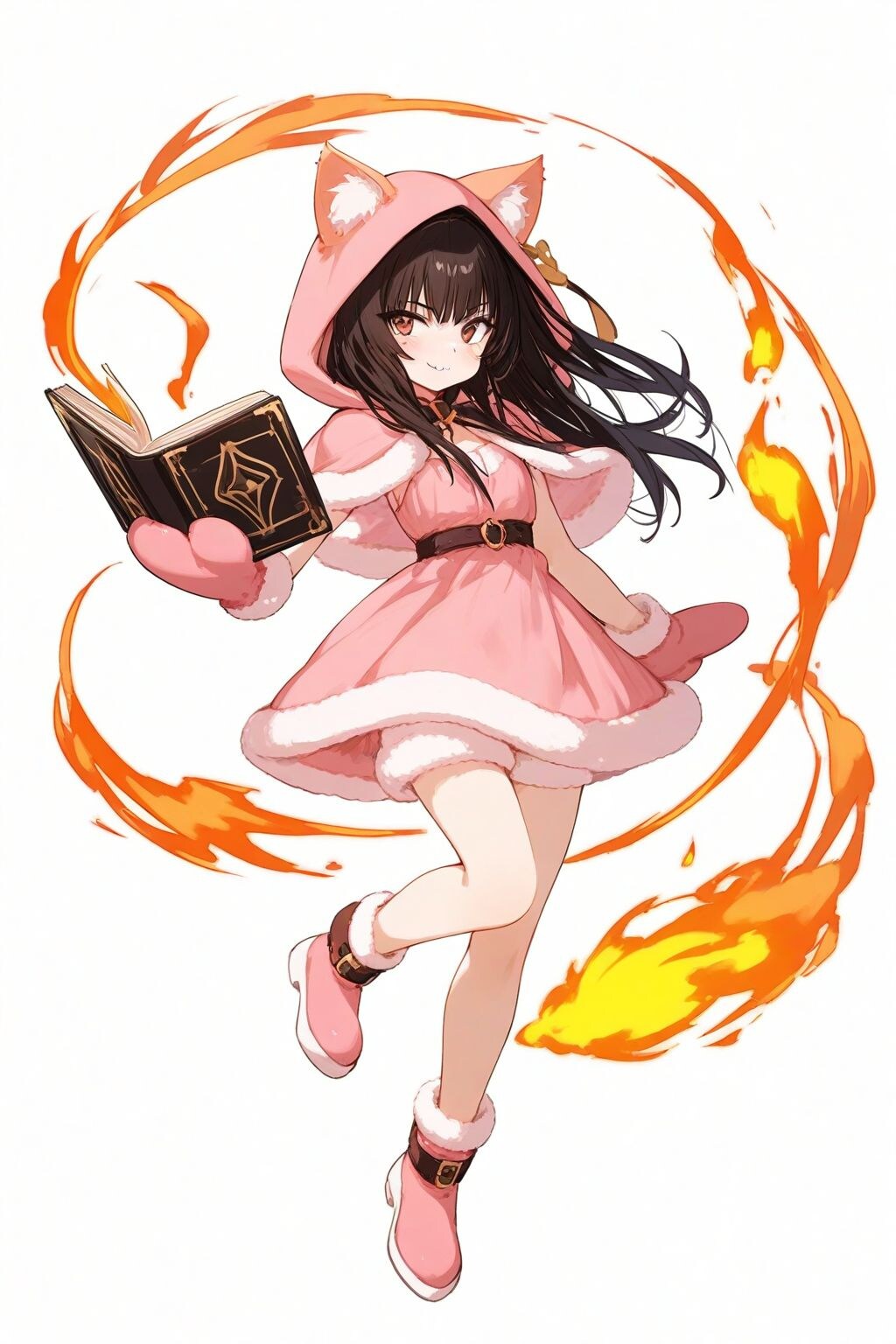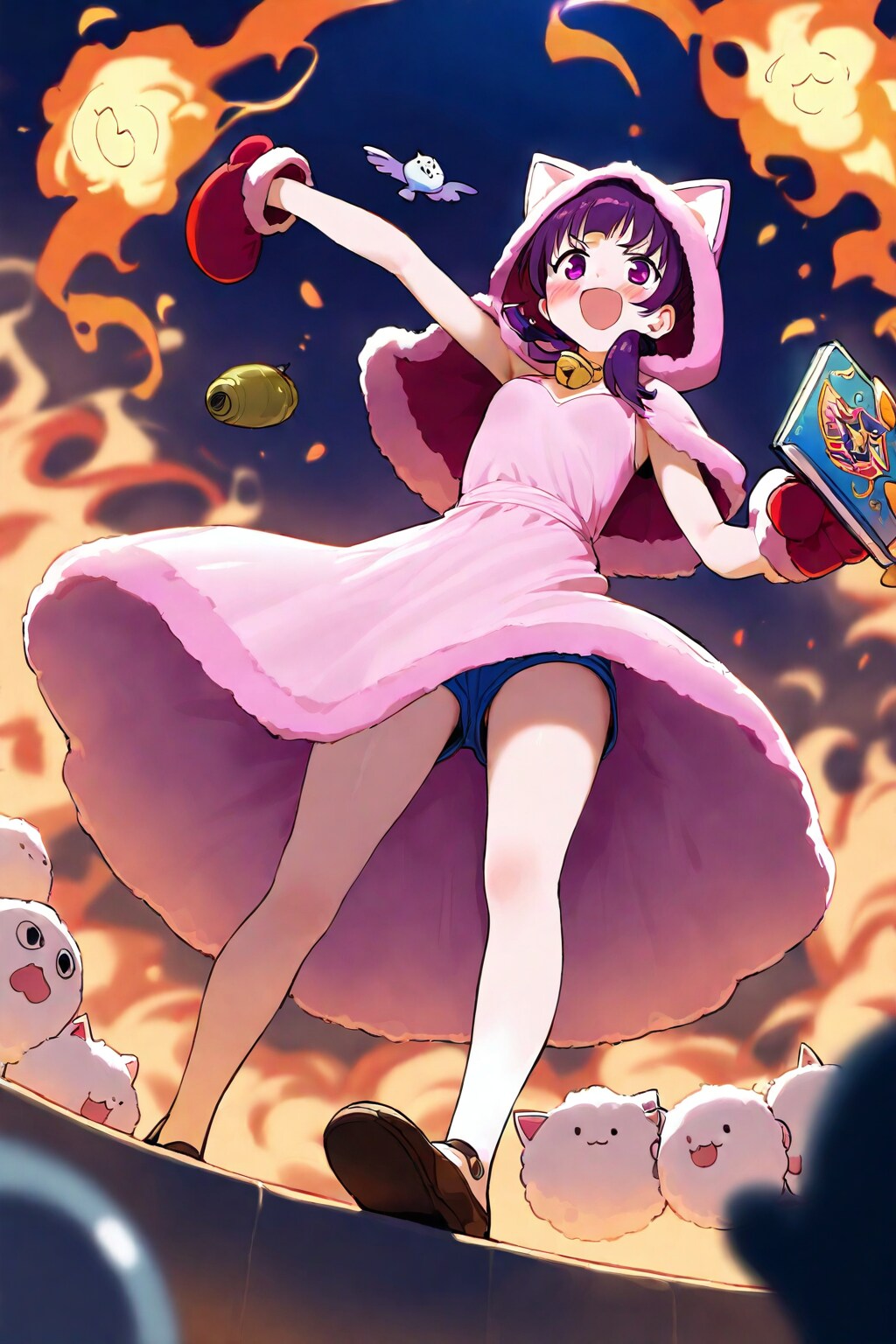 1 Cute and Lovely Girl, Explosive Courage, Fire Dancing, Hot Atmosphere, Girl Floating While Holding a Spell Book, Fluffy, Cat Ears Hooded Pink Dress, Hot Pants, Mittens, Seductive Face, Bewitching, extremely detailed face, exiting,