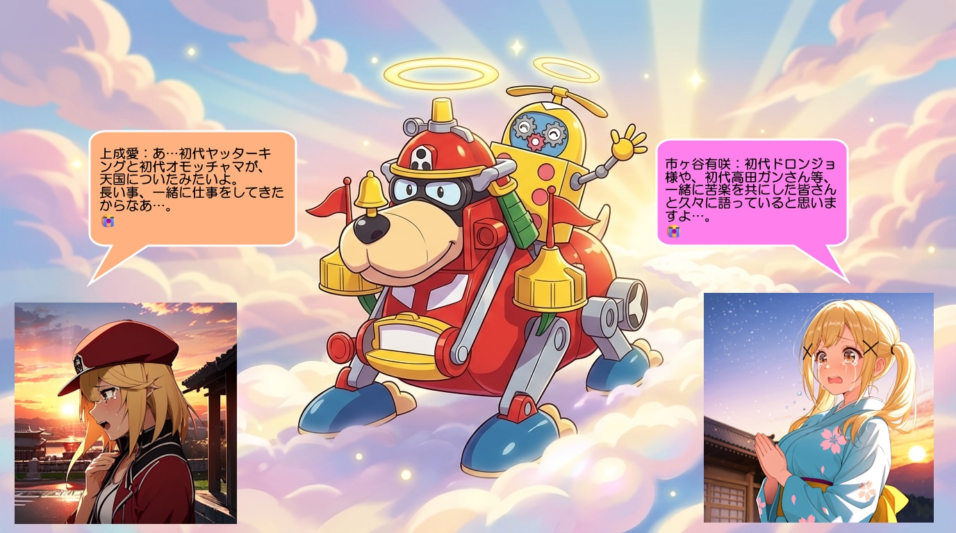 上成愛:あ…初代ヤッターキングと初代オモッチャマが、天国についたみたいよ。長い事、一緒に仕事をしてきたからなあ…。😭