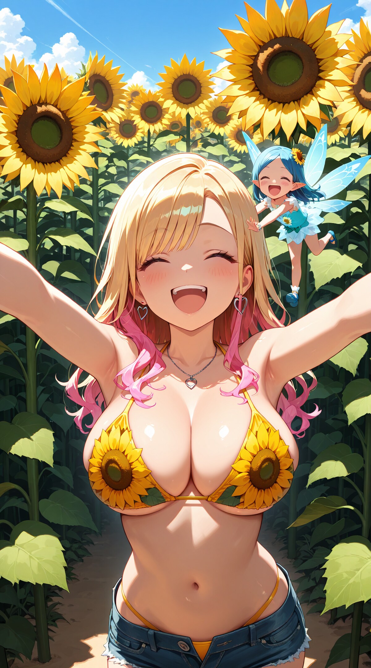 ひまわりビキニって、そんな直球アリなんですか!? すっごい笑顔なのに妖精さんまで飛んでて、テンション爆上がりじゃないですか〜♪