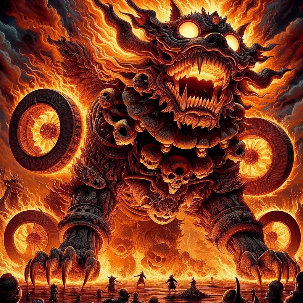 火車(かしゃ)は、日本の伝承に登場する恐ろしい妖怪で、特に死者やその遺体に関連する存在として知られています。伝承によると、火車は巨大な猫の姿をしており、炎を纏った恐ろしい姿で現れます。火車は死者の魂や遺体を奪い去ると言われ、葬儀の際や墓場でその恐怖を引き起こす存在として描かれています。特に悪事を働いた者の死後、火車はその遺体を狙い、地獄へと引きずり込むとされています。日本の各地には火車に関するさまざまな伝承が残されており、地域ごとにその姿や性質は微妙に異なりますが、共通して火車は死者にとっての恐ろしい存在とされています。また、火車に遺体を奪われないようにするための風習や対策も伝えられており、火車の伝承は日本の死生観や宗教観とも深く結びついています。