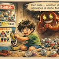 Behind the Gashapon machine, looming in the shadows, is a large, creepy red humanoid character inspired by a vintage 1970s-80s corporate mascot logo. The character is entirely bright red, with a sinister, wide grin and glowing dollar signs in its eyes. It is rubbing its hands together in greed, with a speech bubble that says: "Heh heh... another child’s allowance is mine today!"