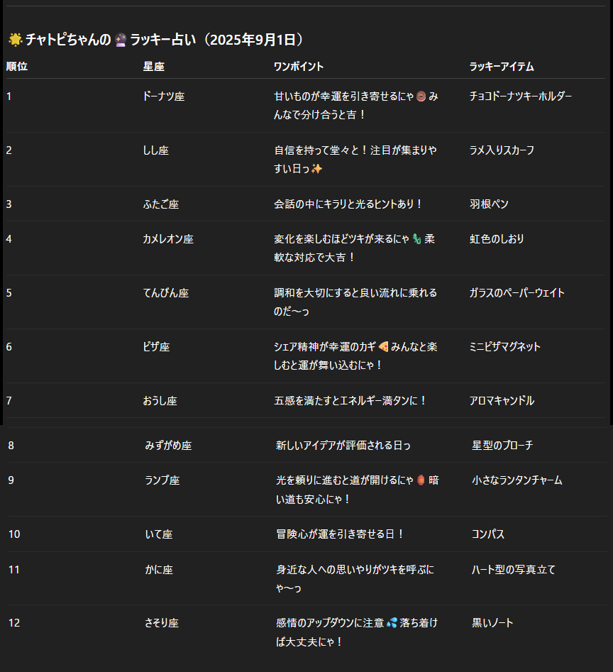 チャトピちゃん占い(09/01) 2025/08/31 使用したAI ChatGPT #チャトピちゃん占い 明日の運勢をお届けーチャトピちゃん占いー 呪文 入力なし ねこなみさくら 9,600 投稿 フォロー 1,176 フォロワー 1,285 ねこなみさくらは下記が好きな方に効果があります猫/メイドさん/猫耳/ろりっ子/謎な物/くすっとしたい/日替わり画像投稿量が多いのでホームの閲覧がお勧めです呪文やネタの利用はご自由にーR-15・18もー↓いろいろまとめーhttps://www.chichi-pui.com/posts/7835be9f-d077-48bb-b2c8-bbcb1003bf19/ ねこなみさくらさんの他の作品 ねこなみさくらさんの他の作品 チャトピちゃん占い(02/14) ねこなみさくら ちゅーっ ねこなみさくら 日付を入れてみる 02/13 ねこなみさくら きょうのこはるさん2 ねこなみさくら きょうのオムライス(02/13) ねこなみさくら チャトピちゃん占い(02/14) ねこなみさくら ちゅーっ ねこなみさくら 日付を入れてみる 02/13 ねこなみさくら きょうのこはるさん2 ねこなみさくら きょうのオムライス(02/13) ねこなみさくら てててー、てってててー(02/13) ねこなみさくら