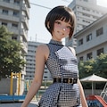 masterpiece, best quality, amazing quality, very aesthetic, high resolution, ultra-detailed, absurdres, newest, scenery, 3d, rendered, 1girl, stunning detailed beautiful face, detailed eyes, aged up, grin, cropped haircut, mini_skirt_dress, dot_pattern, stylish_clothes_geometric_print_fashioned_like_60's, sleeveless dress, waist belt, high waist skirt, flat chest, from below, standing, looking at viewer, dynamic pose, dynamic angle, outdoors, sunlight, danchi, public housing, apartment complex, concrete building, 1960s japan, retro architecture, balcony, clothesline, playground, park, public park, bench, nostalgia, blurry background, cinematic_lighting, BREAK, depth_of_field, volumetric_lighting,