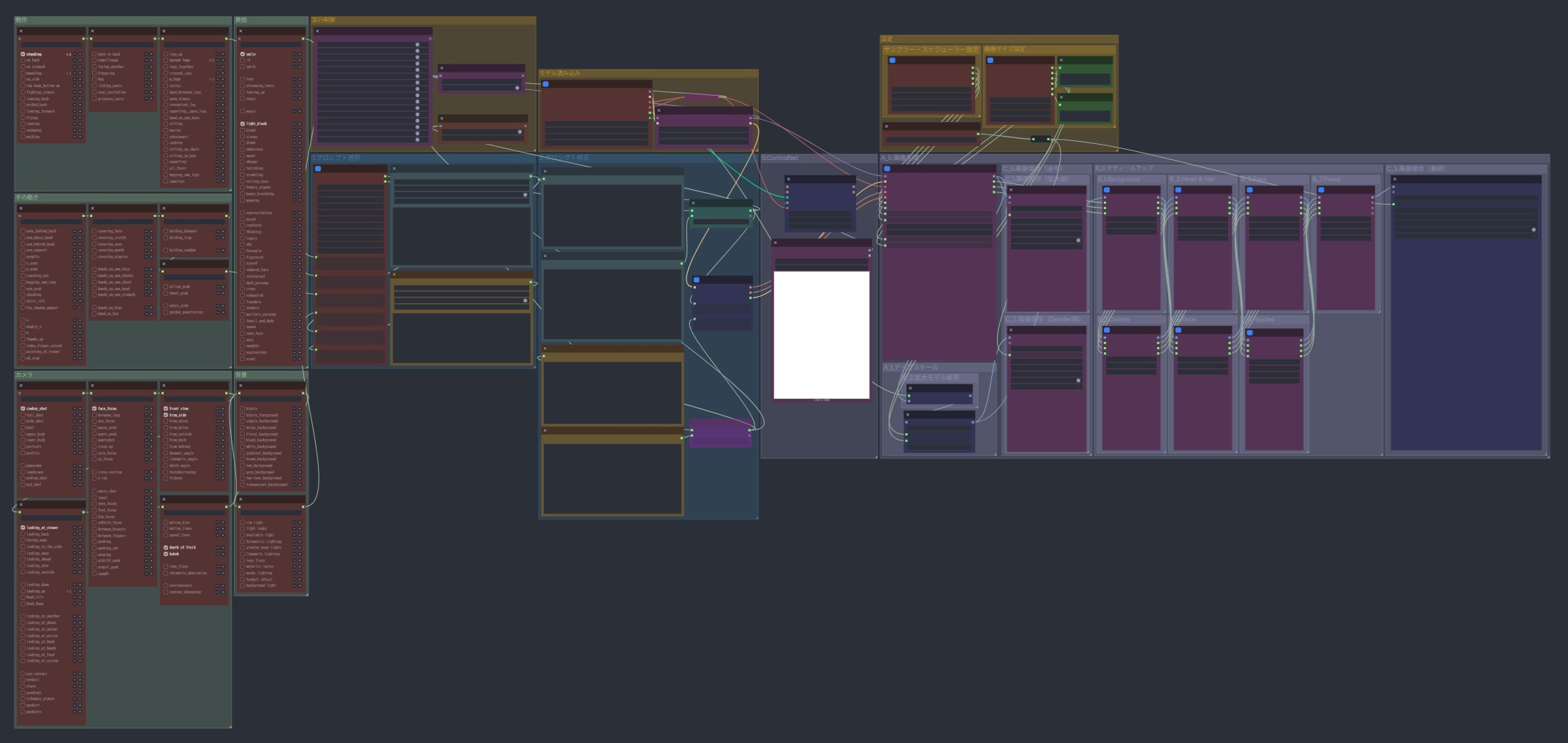 ComfyUIの使いにくい部分(プロンプト入力の補助、画像サイズの縦横入れ替えなど)を考慮し、ControlNetを使ったポーズ指定、各部のデティールアップが可能な物になっています。