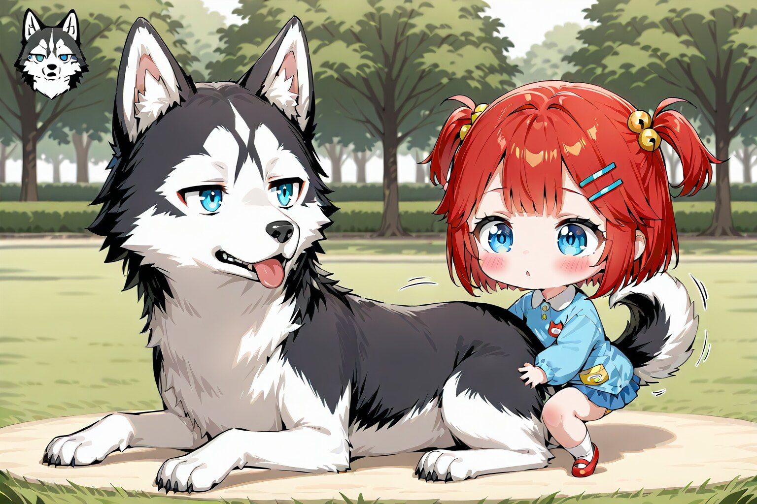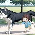 シベリアンハスキーにまたがってご満悦の小鈴ちゃん。ところが………。