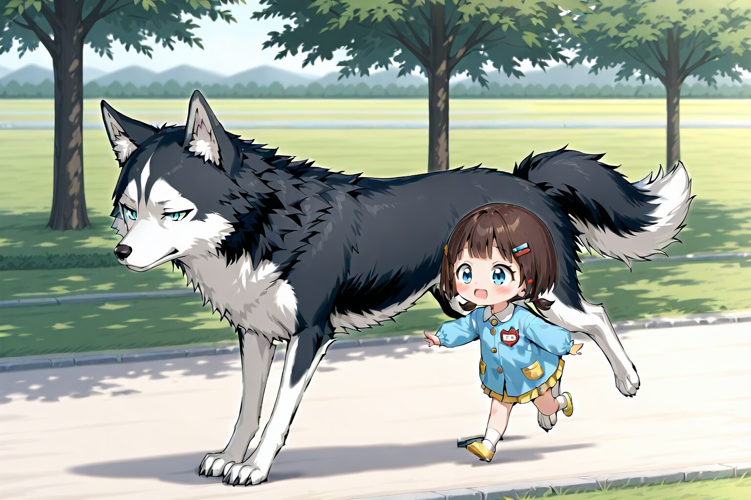 幼稚園児の小鈴ちゃんがシベリアンハスキーにまたがって正面をビシッと指さしています。