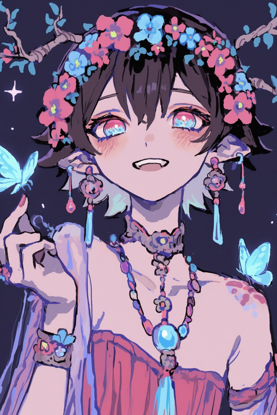 森の奥に住む妖精のような少年。花と宝石に囲まれて、優しい微笑みを浮かべています。