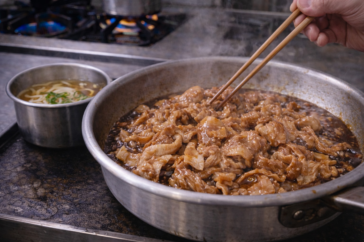 そして、うどん屋も同じ土俵に立っています。うどん屋の麺つゆもまた、醤油の芯と甘みの丸さ、だしの余韻を“店の味”として長く育てている。つまり、丼物や肉料理に転用した瞬間に、味が“店の顔”になります。
