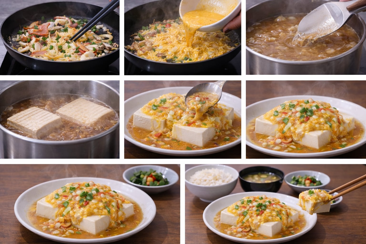 木製テーブルに置かれた瞬間、まず目が引き寄せられるのは“艶”だ。とろみ餡が皿の上で光を返し、湯気がゆるく立ち上がる。天津豆腐は、見た目の派手さではなく、この温度ととろみで食欲を起こす料理だ。卵の黄色に、刻みねぎの緑。控えめな色数が、かえって上品に見える。