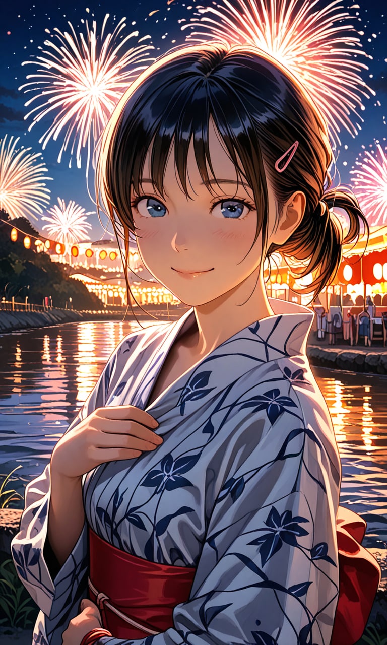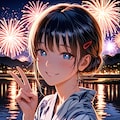 夏祭りの花火をバックに かわいい浴衣を着る少女を撮ってみました。