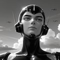 Masterpiece, Best Quality, Amazing Quality, Very Aesthetic, High Resolution, Ultra-Detailed, Absurdres, Newest, Scenery, 3D, Rendered, General, 1Boy, Retro, 1960s, Black_and_White, Grayscale, Tetsuwan_Atom, Astro_Boy, (Flight_Posture:1), Bend_Elbow, Raise_Chin, Nostalgic, Historical_Setting, Cinematic_Lighting, BREAK, Depth_of_Field, Volumetric_Lighting,